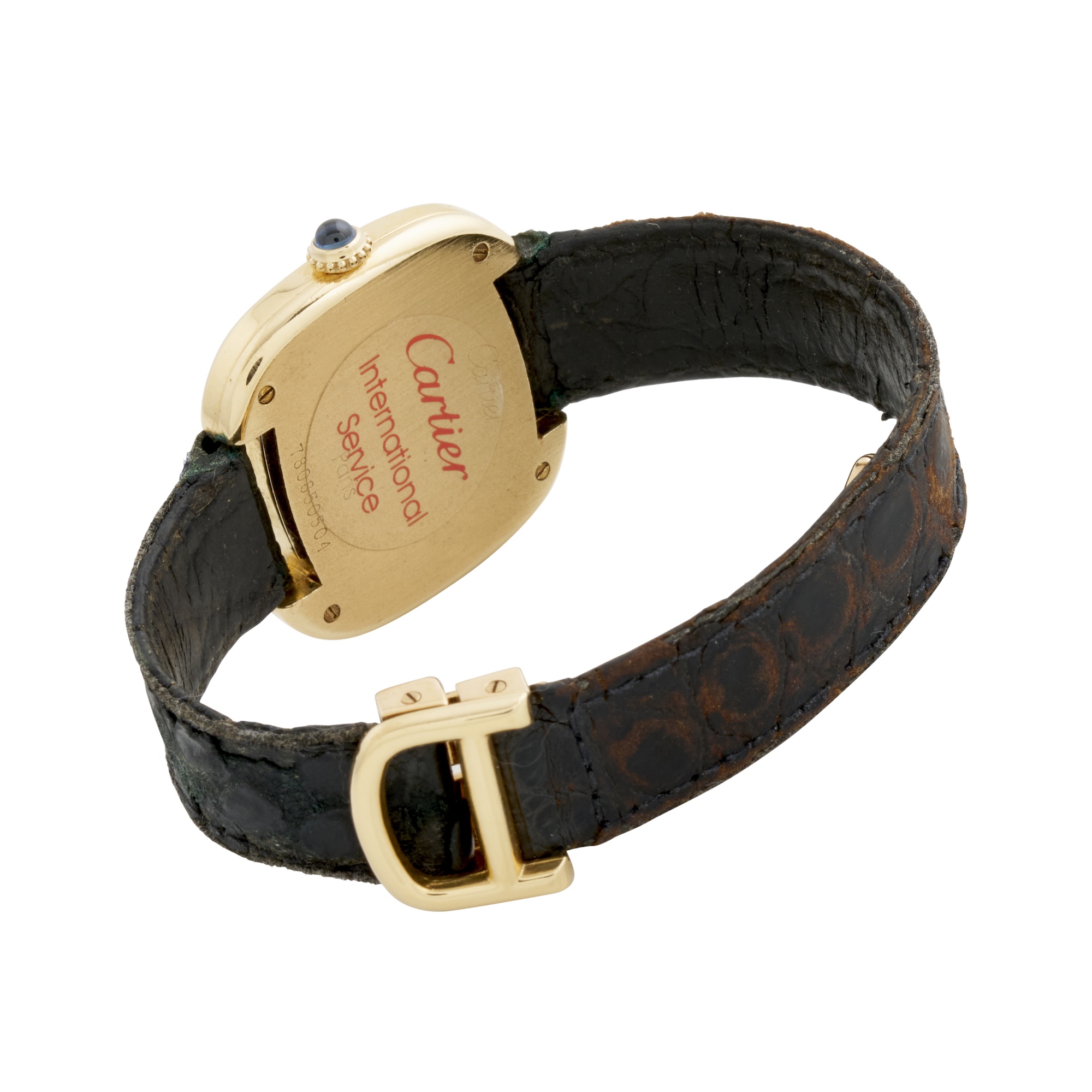 Closure: Cartier black leather stap and 18ct gold deployant clasp