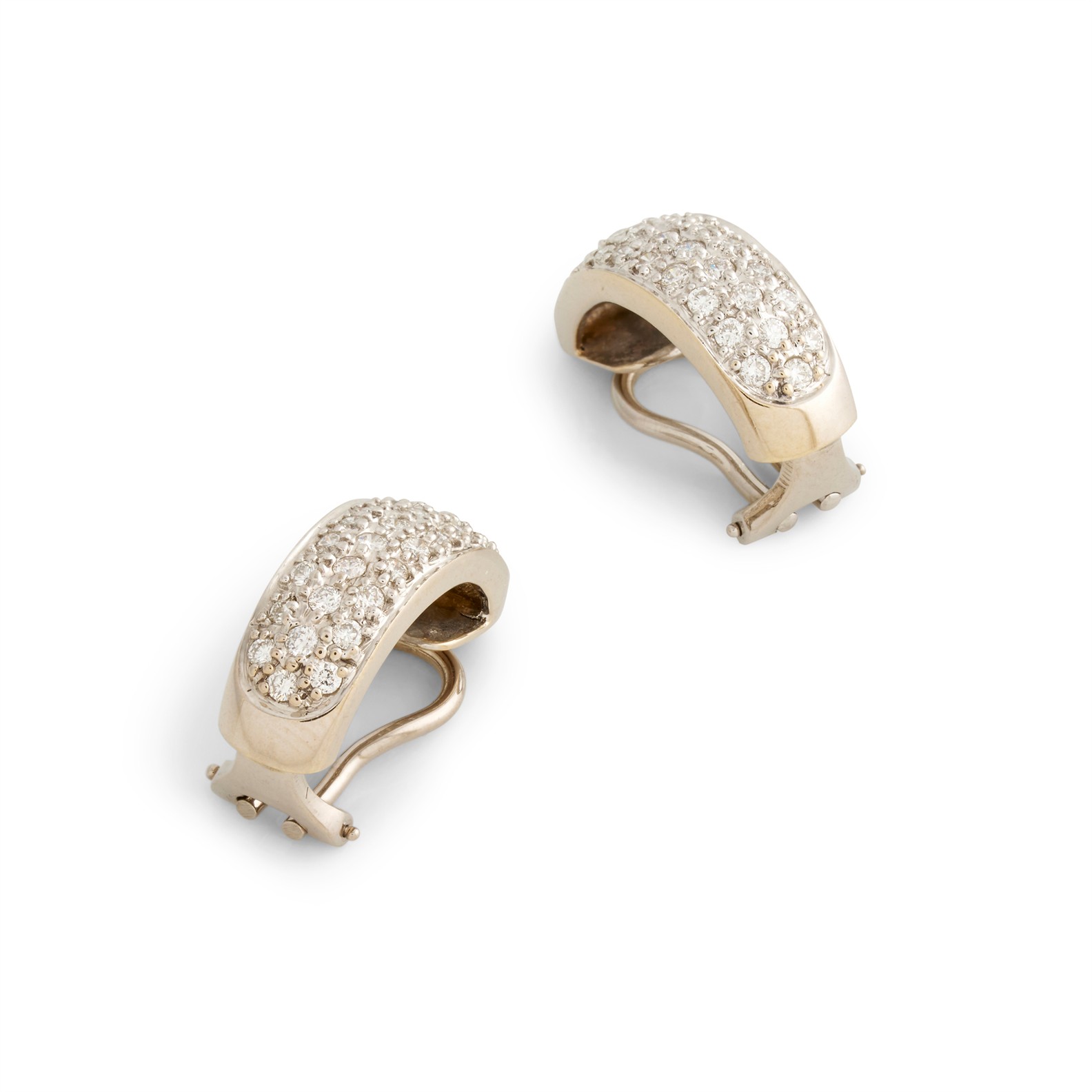Each 6.8mm half hoop is pavé-set with brilliant-cut diamonds, the diamonds together weighing approximately 1.64 carats, mounted in 18ct white gold, length 20mm, clip fittings, gross weight approximately 7.6 grams.
