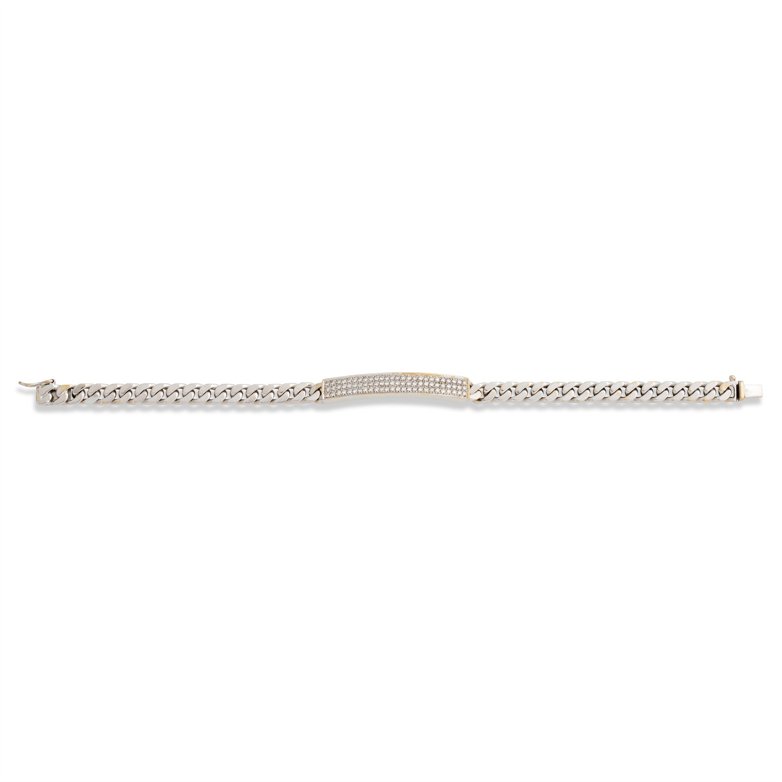 Centring a rectangular plaque pavé-set with brilliant-cut diamonds, suspended between curblinks, the diamonds together weighing approximately 1.17 carats, completed by a concealed box clasp, mounted in rhodium plated 18ct yellow gold, length 200mm, gross weight approximately 28.2 grams.