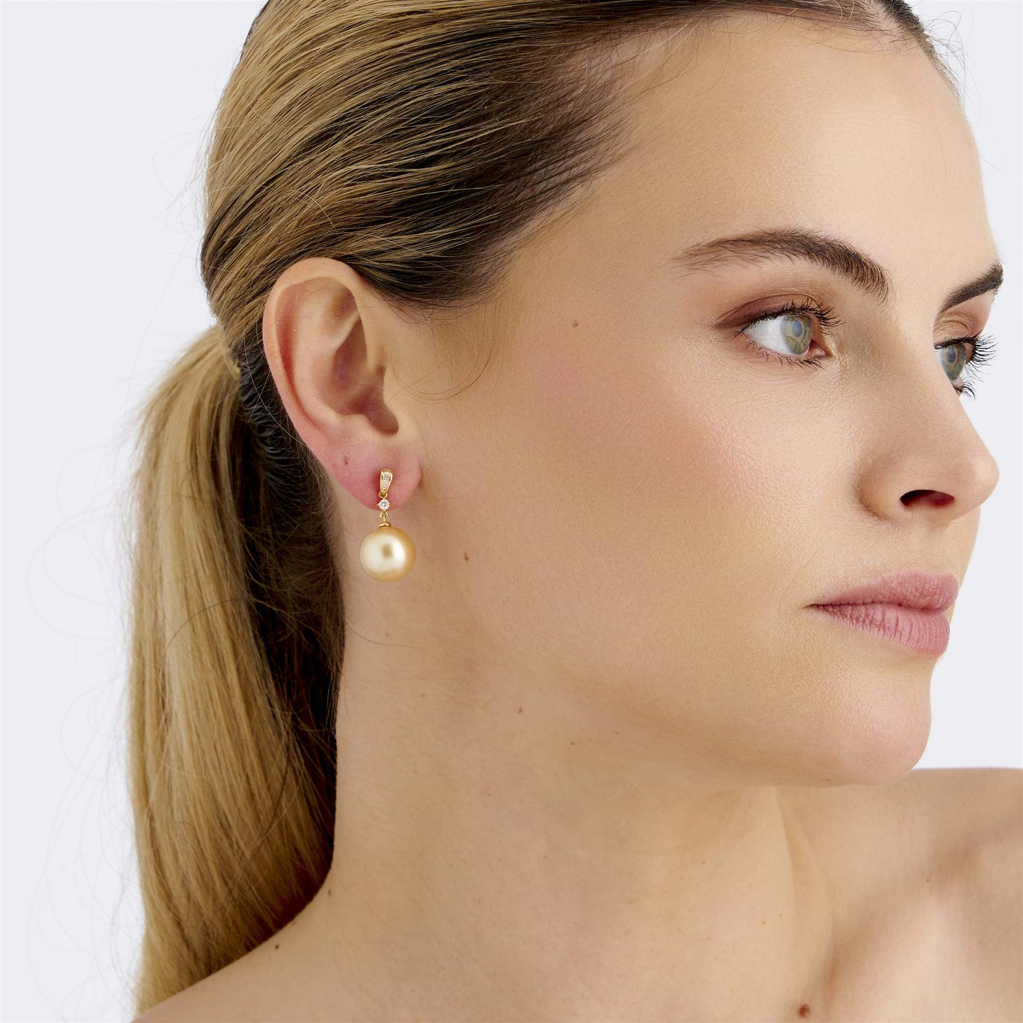 Each comprising a round golden south sea pearl of approximately 13.3mm with high lustre, articulated from a claw-set diamond on a graduated fitting of baguette-cut diamonds to a post and clip, the diamonds together weighing approximately 0.18 carats, length of drop approximately 30mm, gross weight approximately 8.7 grams.