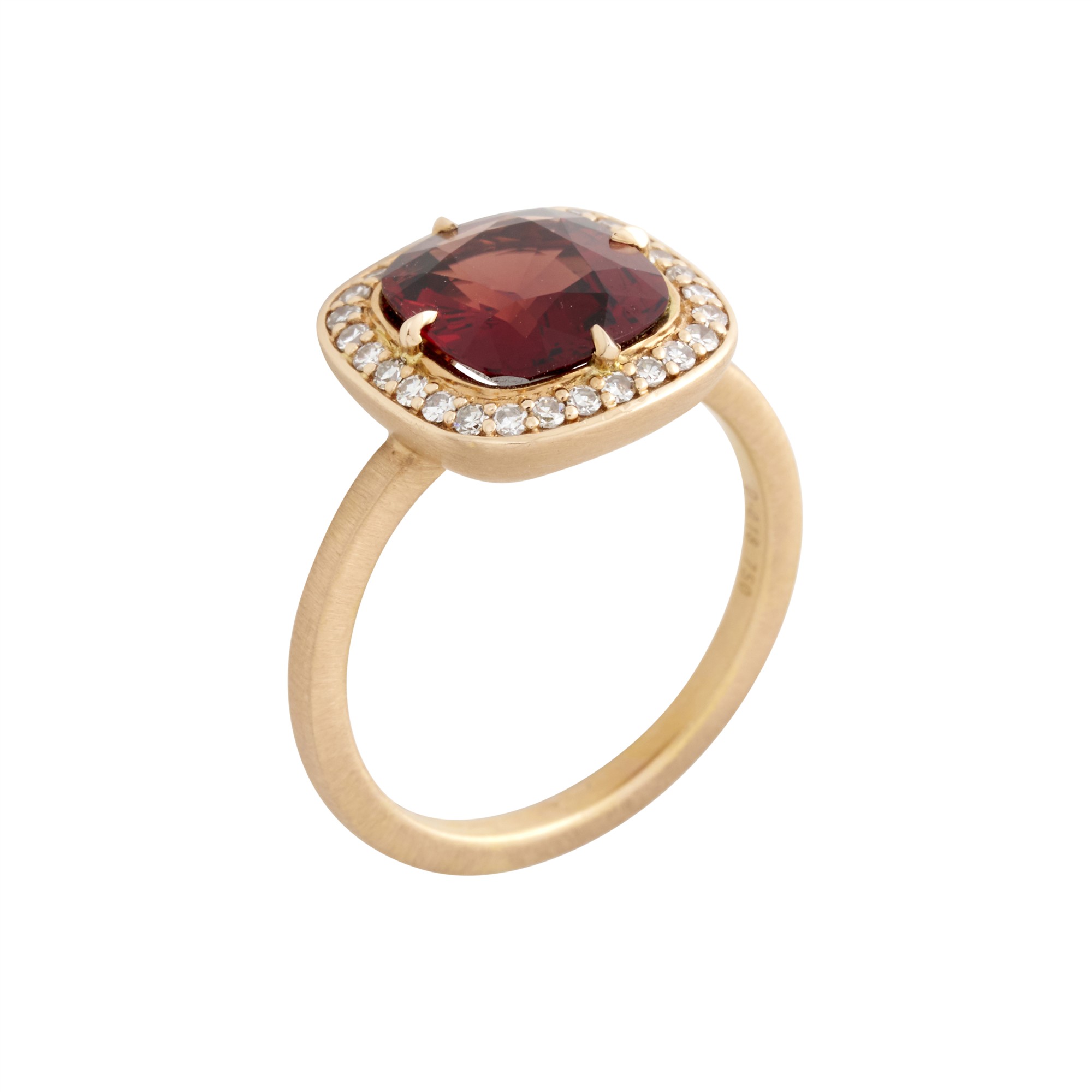 Centring a cushion cut orange-red Burmese unheated, untreated, spinel weighing approximately 2.66 carats framed by twenty-eight round brilliant-cut diamonds to a satin finish on a rounded band, the diamonds together weighing approximately 0.18 carats, size L1/2, gross weight approximately 4.7 grams
