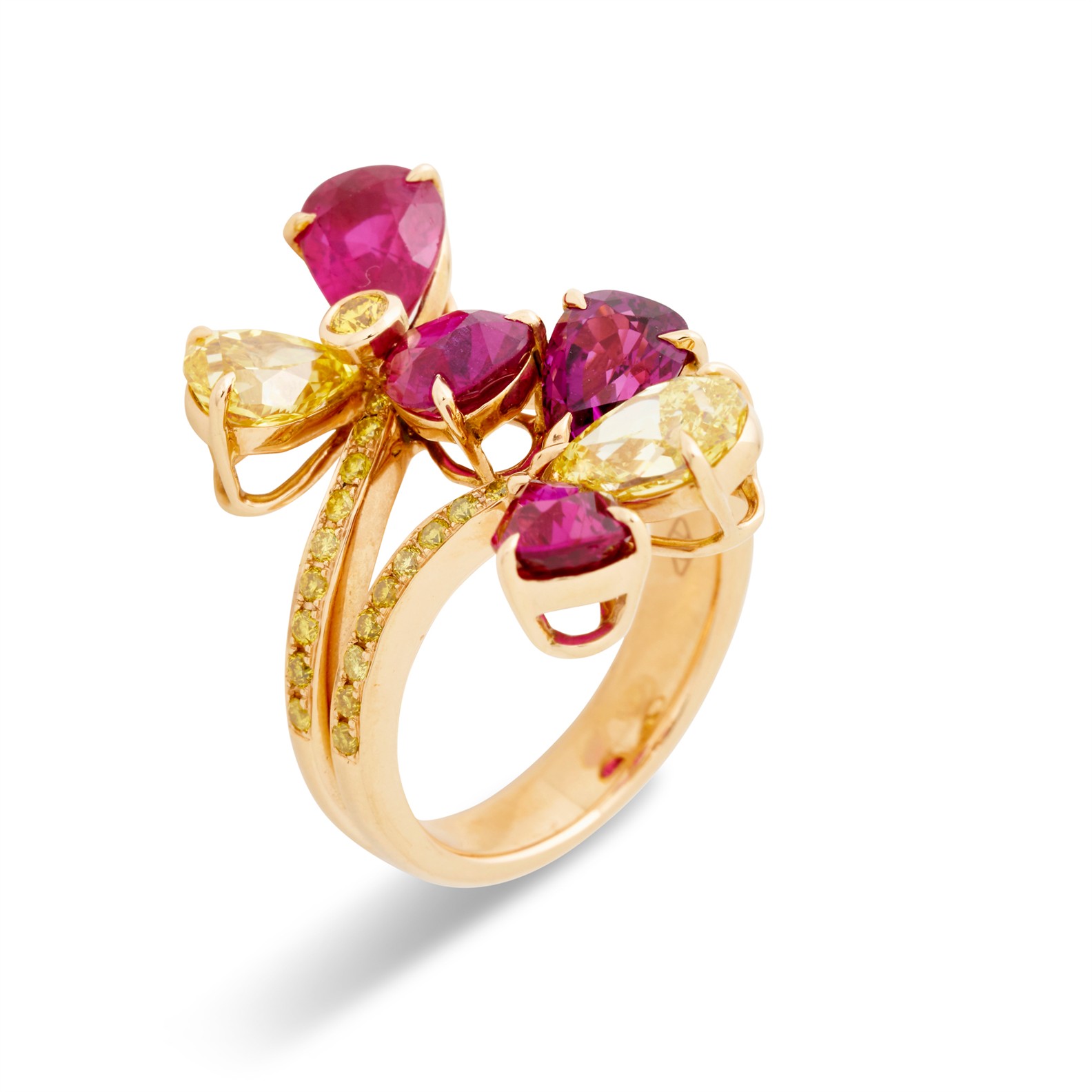 Of floral design, the stamens collet-set with a fancy yellow brilliant-cut diamond, to petals claw-set with a pear modified brilliant-cut fancy vivid yellow diamond weighing 0.95 carats and a fancy intense yellow diamond weighing 1.34 carats, embellished by similarly set pear-shaped rubies to pavé-set split shoulders, the small fancy yellow diamonds and rubies together weighing approximately 0.44 carats and 5.43 carats respectively, mounted in 18ct rose gold, size N1/2, gross weight approximately 11.0 grams.