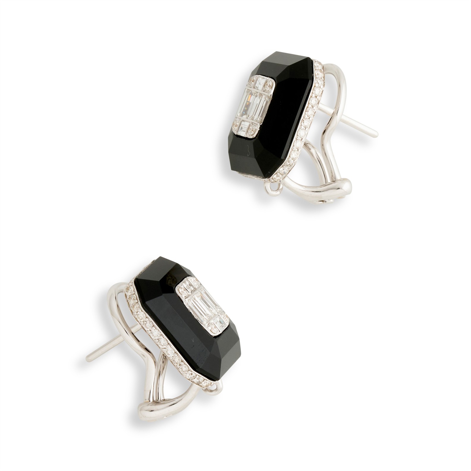 Each centring a cluster of pavé and collet-set baguette and brilliant-cut diamonds within a bevelled plaque of onyx, framed by a line of pavé-set brilliant-cut diamonds, the diamonds together weighing approximately 1.04 carats, mounted in 18ct white gold, length 15mm, post and clip fittings, gross weight approximately 9.4 grams.