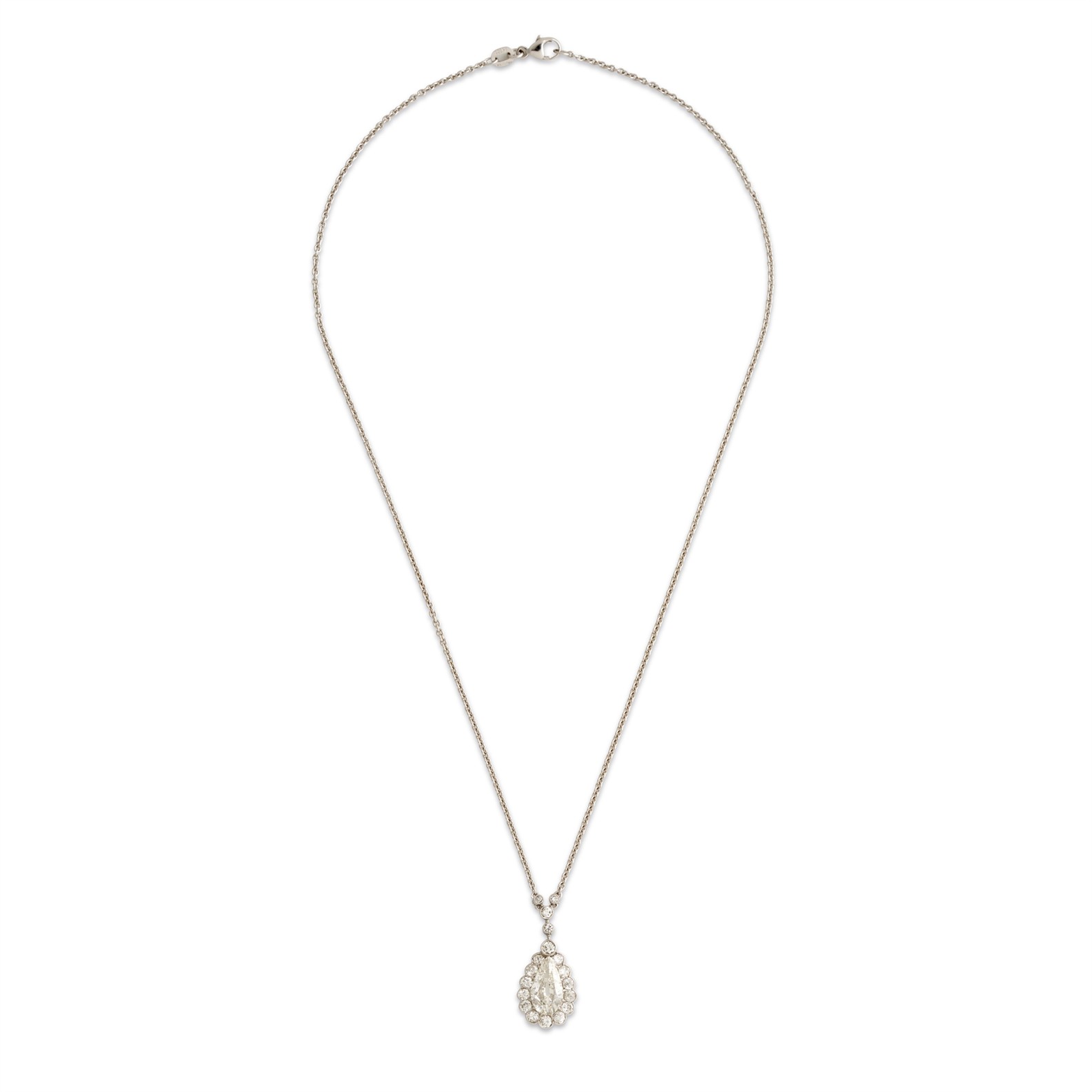 Of cluster design, centring a claw-set pear-shaped diamond weighing approximately 1.20 carats, framed by a halo of collet-set circular-shaped diamonds surmounted by a similarly set bale, the small diamonds together weighing approximately 1.00 carats, suspended from a trace chain, mounted in platinum, inner circumference 410mm, gross weight approximately 6.7 grams.