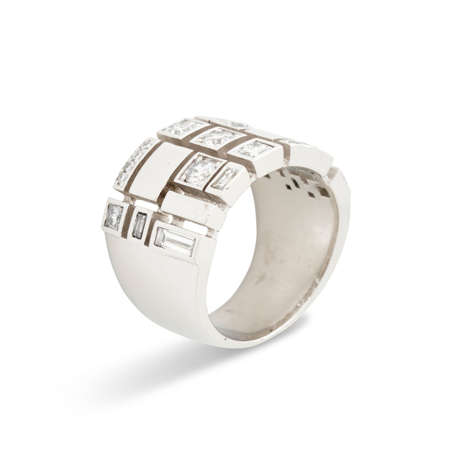 The 14.7mm wide band of cubism design is collet and pavé-set with a mosaic of baguette, princess and brilliant-cut diamonds, the diamonds together weighing approximately 1.62 carats, mounted in 18ct white gold, size O, gross weight approximately 21.3 grams.