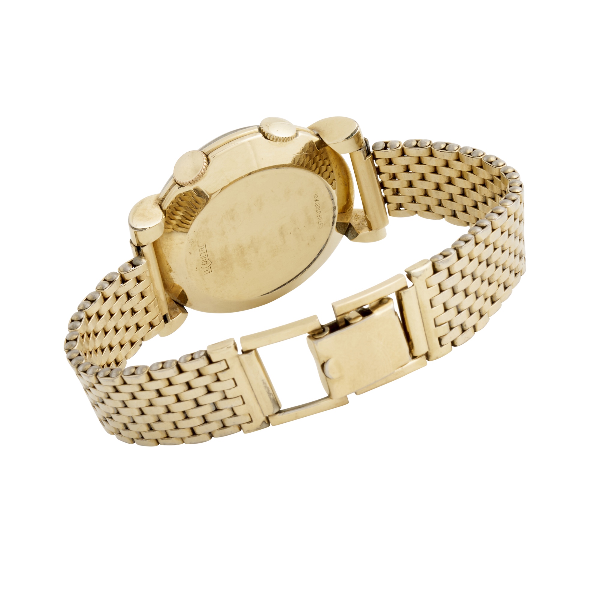 Case: polished round, snap on case back, crowns at 2 and 4 for hand setting, winding and alarm, flared lugs