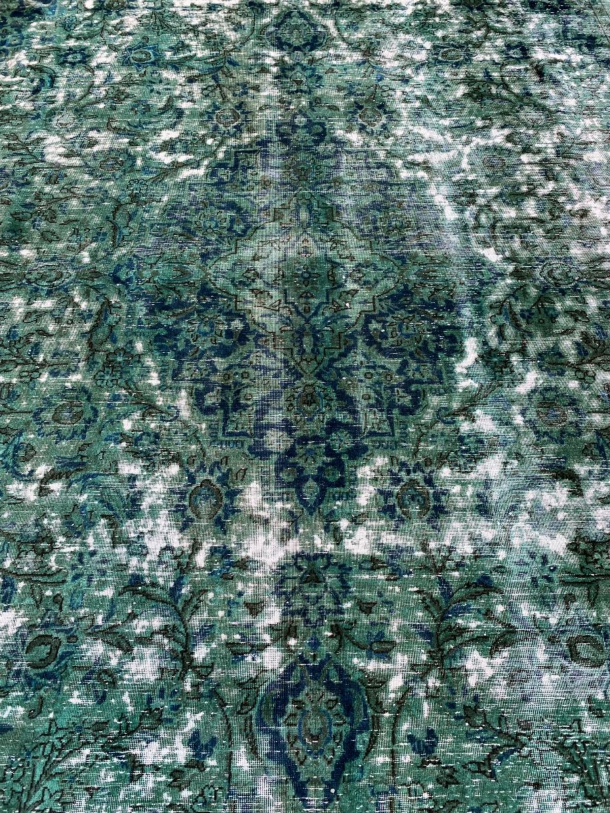 HAND-KNOTTED CITY WEAVE FROM THE AZERBAIJAN PROVINCE WITH CLASSIC FLORAL MEDALLION DESIGN OVER-DYED IN VIBRANT SHADES OF EMERALD GREEN & INDIGO.