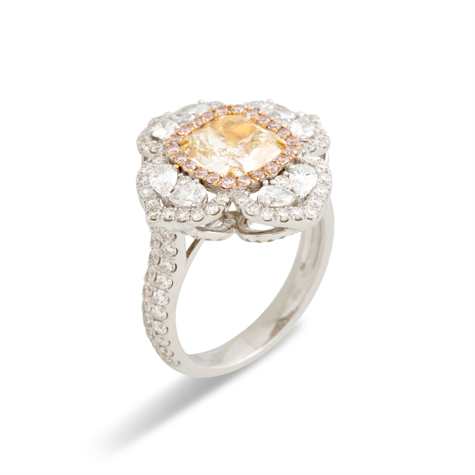 Of floral design, centring a claw-set cushion-shaped fancy light yellow diamond weighing approximately 2.00 carats, framed by a halo of pavé-set fancy pink light diamonds, to petals claw-set with pear-shaped diamonds within a frame of pavé-set brilliant-cut diamonds to similarly set gallery and shoulders, the fancy light pink diamonds and near-colourless diamonds together weighing approximately 0.21 carats and 1.86 carats respectively, mounted in 18ct white and rose gold, size N1/2, gross weight approximately 6.7 grams.
