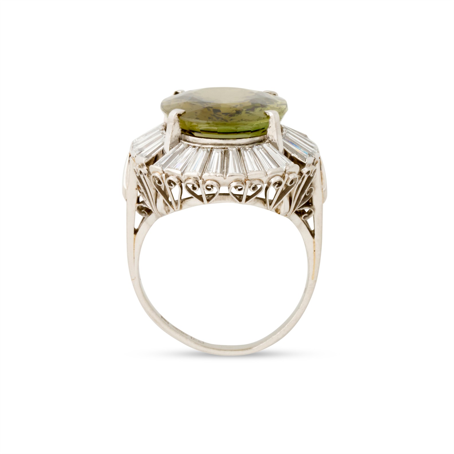 Of cluster design, centring a claw-set oval alexandrite weighing 10.31 carats, within a frame of baguette-cut diamonds together weighing approximately 2.50 carats, mounted in platinum, size M, gross weight approximately 11.6 grams.