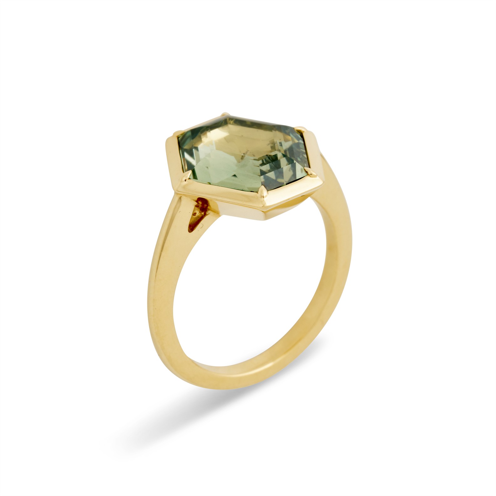Centring a collet and claw-set hexagonal-shaped green sapphire weighing 6.70 carats, mounted in 18ct gold, size N, gross weight approximately 8.0 grams.
