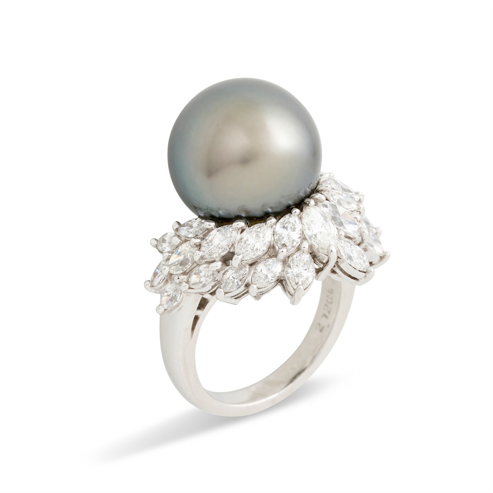Of cluster design, centring an approximately 14mm Tahitian pearl, embellished by claw-set marquise-cut diamonds, the diamonds stated to weigh 2.12 carats, mounted in platinum, size M, gross weight approximately 14.6 grams.
