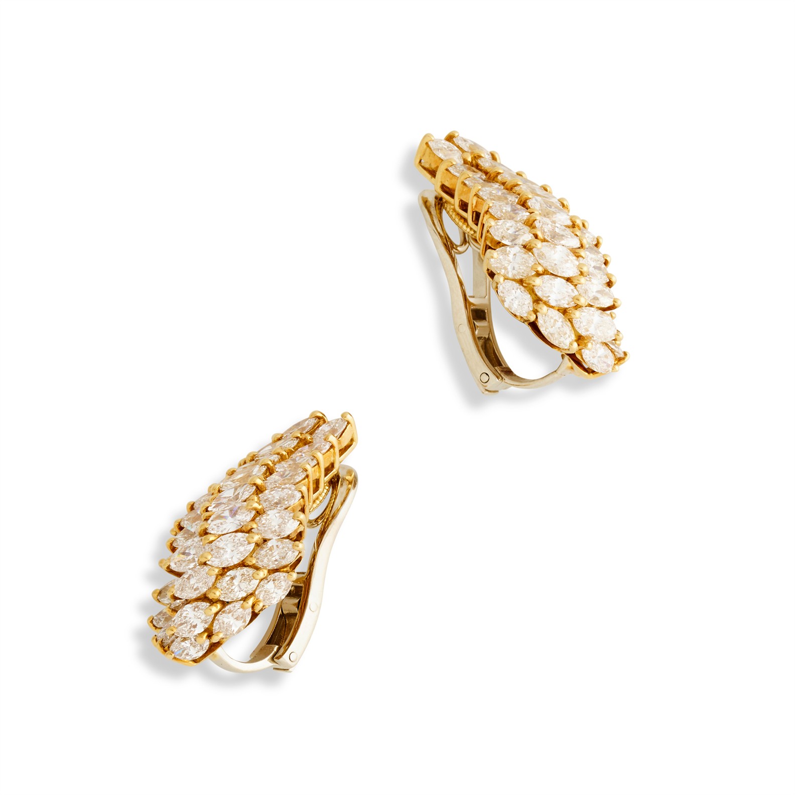 Each of stylised ribbon design, claw-set to the front with marquise-cut diamonds, the diamonds together weighing approximately 7.00 carats, mounted in 18ct gold, length 26mm clip fittings, gross weight approximately 18.8 grams, signed T&Co. Italy.