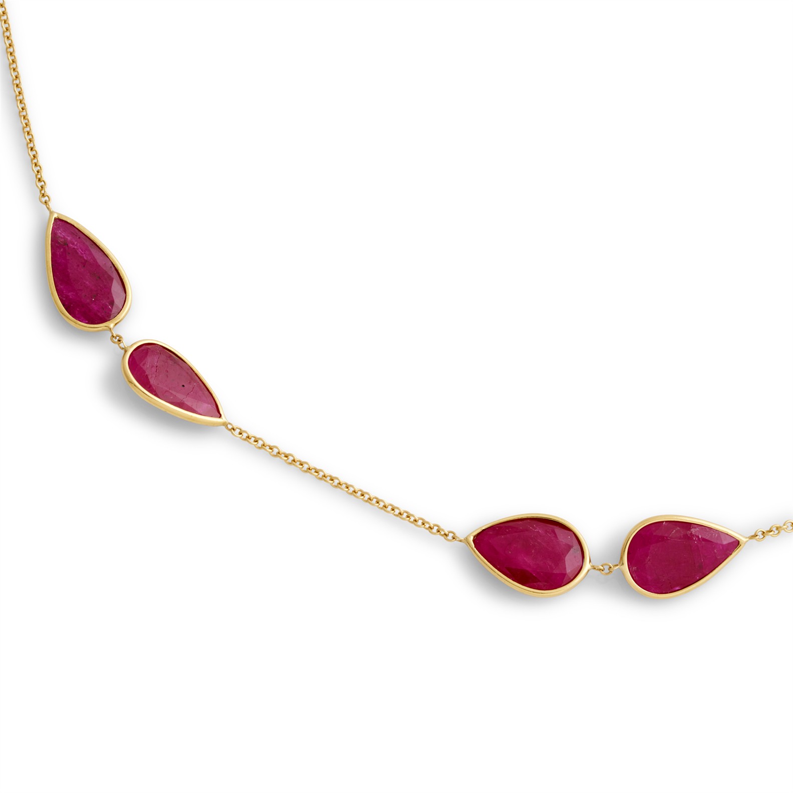 Designed as a line of 14 spectacle-set pear-shaped rubies, alternating between trace chain connectors, the rubies together weighing approximately 55.63 carats, mounted in 18ct gold, inner circumference 485mm, gross weight approximately 18.1 grams.