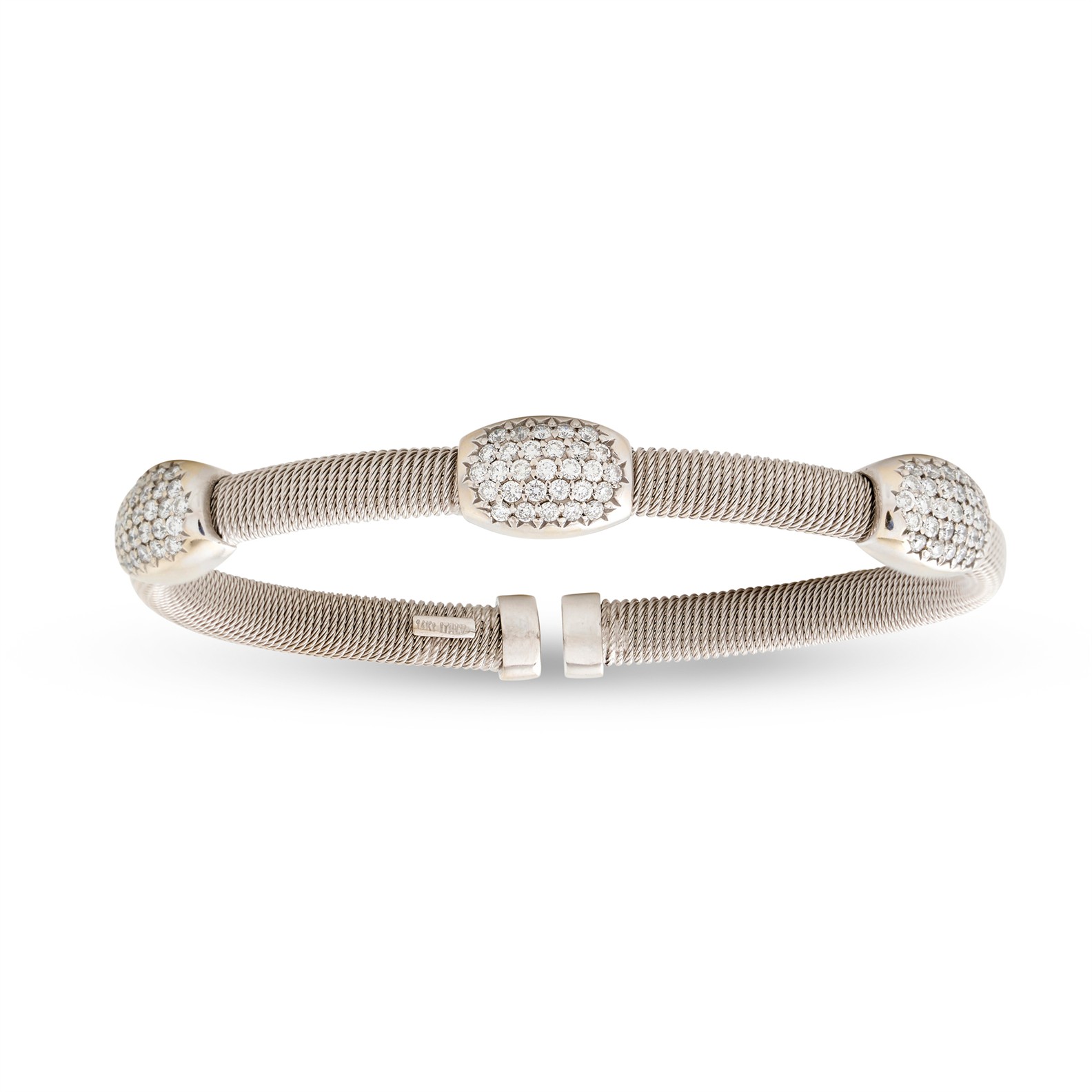 The flexible oval cuff of coiled wire design is set to the front with three plaques of pavé-set brilliant-cut diamonds, the diamonds together weighing approximately 0.90 carats, inner circumference 160mm, gross weight approximately 17.8 grams, stamped Italy.