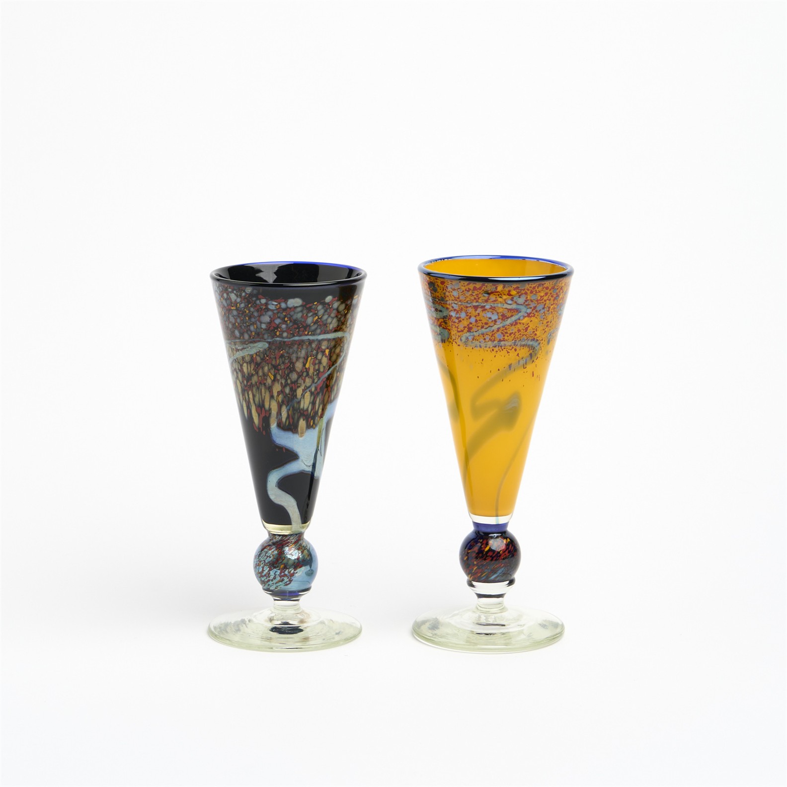 A PAIR OF AUSTRALIAN STUDIO GLASS CHAMPAGNE FLUTES, SIGNED H.18CM