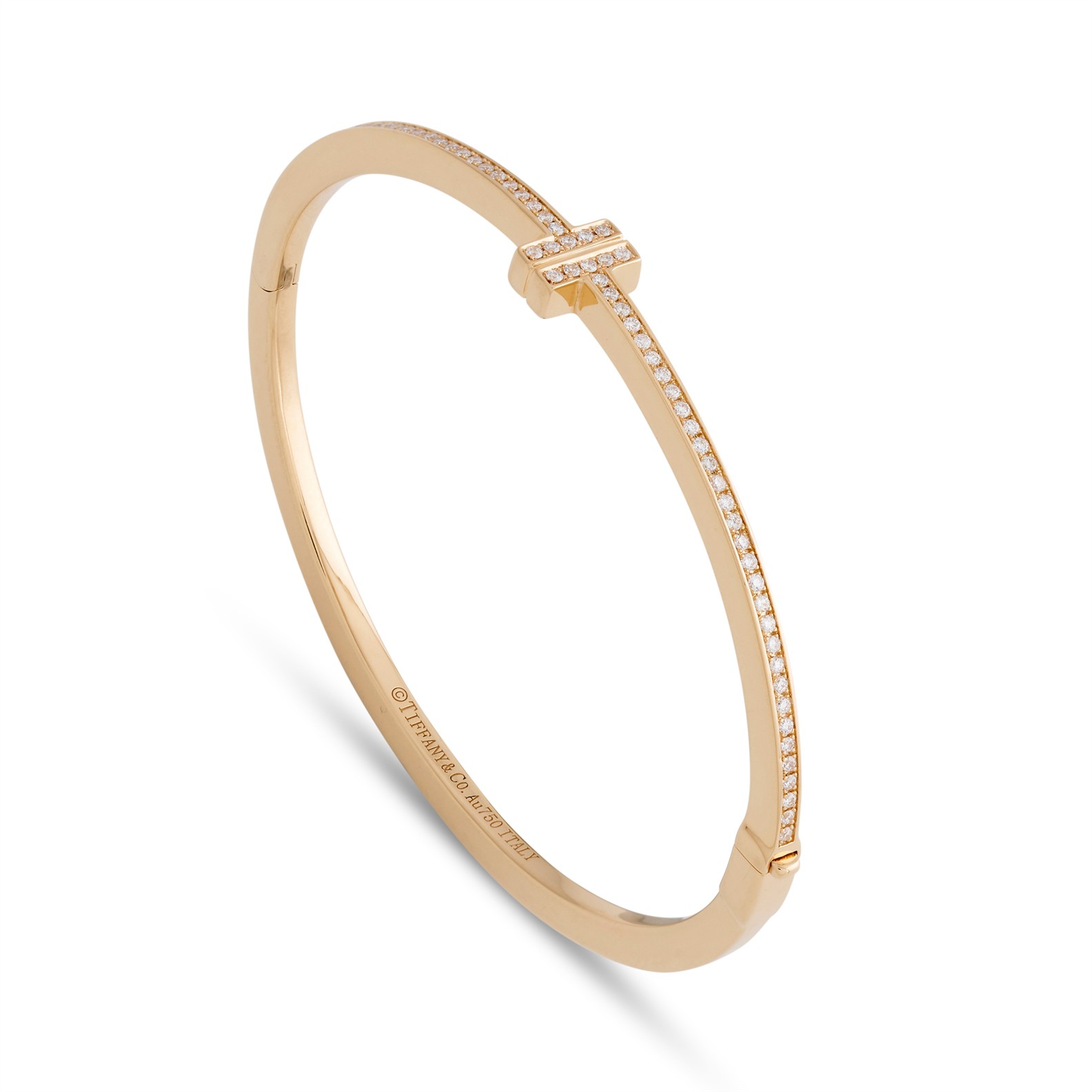 The hinged oval bangle is pavé-set to the front with brilliant-cut diamonds forming opposing 'T' motifs, the diamonds together weighing approximately 0.33 carats, mounted in 18ct rose gold, inner circumference 150mm, gross weight approximately 17.3 grams, signed Tiffany & Co. Italy.