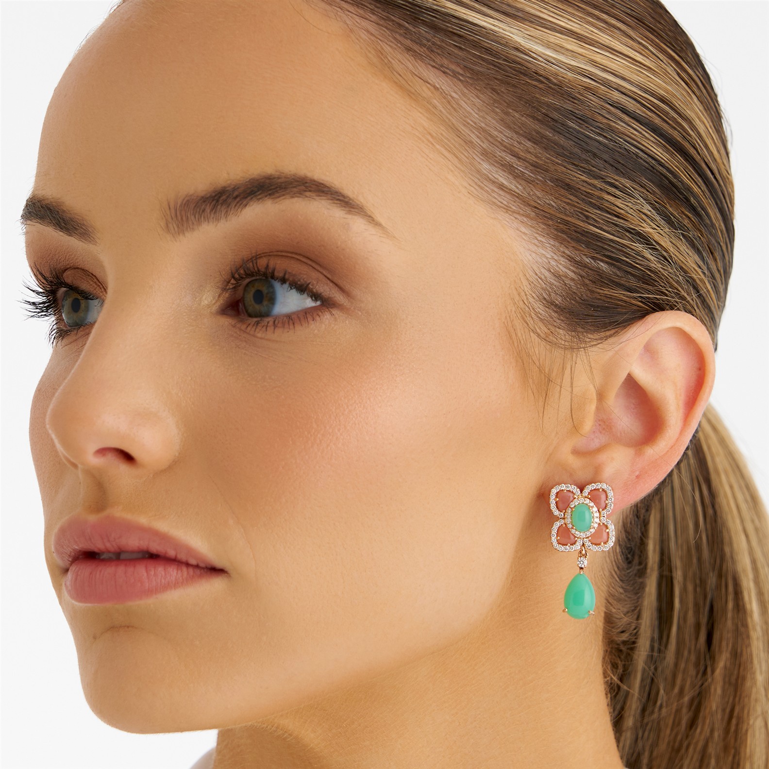 Each of floral design, terminating in a detachable claw-set pear-shaped cabochon chrysoprase swing drop, surmounted by a cluster centring a similarly set oval cabochon chrysoprase, framed by cabochon pink opals petals and outlined by brilliant-cut diamonds, the chrysoprase, pink opal and diamonds together weighing approximately 8.43 carats, 1.88 carats and 1.26 carats respectively, mounted in 18ct rose gold, length 33mm, gross weight approximately 14.1 grams.
