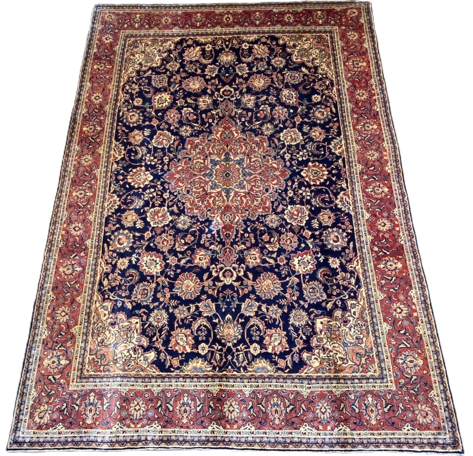 FINELY HAND-KNOTTED CITY WEAVE WITH SAROUQ DESIGN OF A FLORAL MEDALLION & QUARTERED CORNER MEDALLIONS IN A ROYAL PERSIAN BLUE FIELD OF BOLD PALMETTES, FLORAL SPRAYS & SAZ LEAVES.