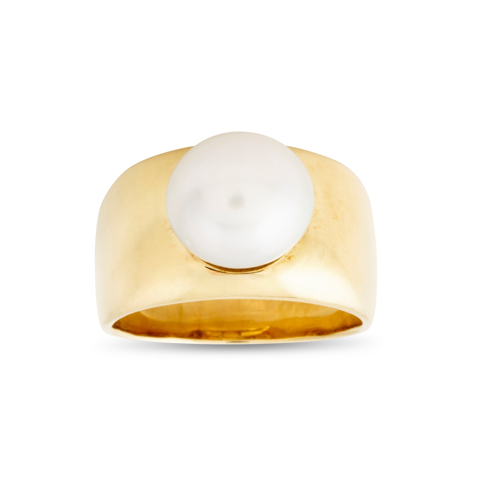 Centring a white semi baroque South Sea pearl measuring approximately 11mm, mounted in 18ct gold, size W, gross weight approximately 19.5 grams, maker's mark for Paspaley.
