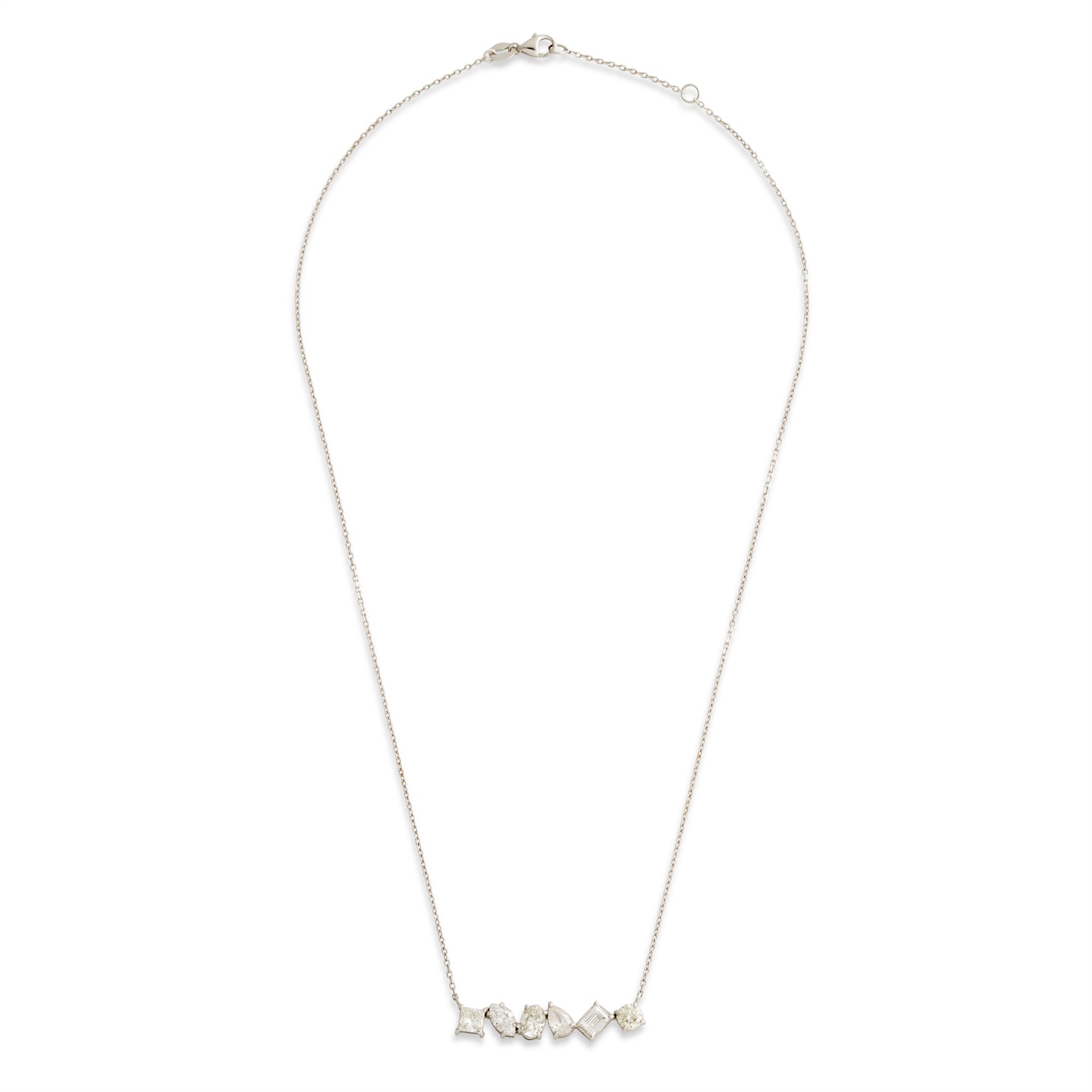Comprising a line of 5 claw-set fancy-shaped and brilliant-cut diamonds together weighing approximately 2.35 carats, suspended from a trace chain, mounted in 18ct white gold, inner circumference 430mm, gross weight approximately 3.7 grams.
