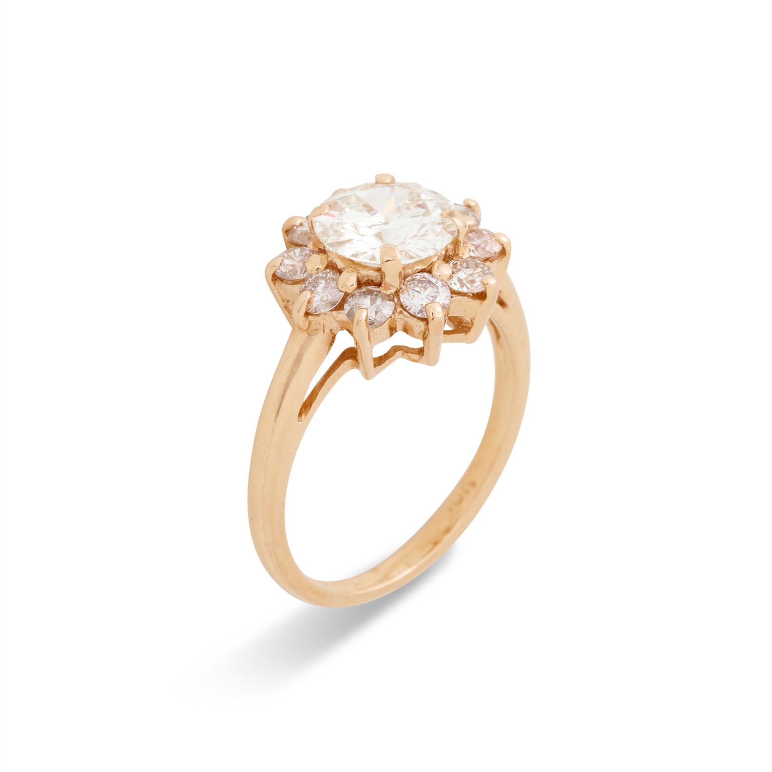 Of cluster design, centring a claw-set brilliant-cut diamond, weighing approximately 1.40 carats, framed by a halo of claw-set brilliant-cut light pink diamonds together weighing approximately 0.82 carats, mounted in 18ct rose gold, size L1/2, gross weight approximately 4.2 grams.