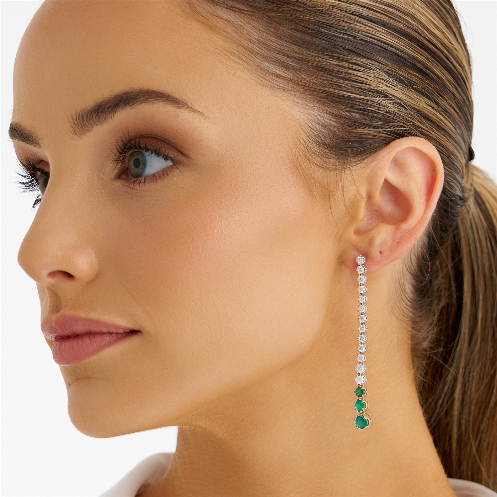 Each of drop design, comprising a line of claw-set brilliant-cut diamonds weighing approximately 2.88 carats, terminating in claw-set circular-cut emeralds, the emeralds together weighing approximately 2.38 carats, mounted in 14ct white and yellow gold, post and scroll fittings, length 70mm, gross weight approximately 4.3 grams.
