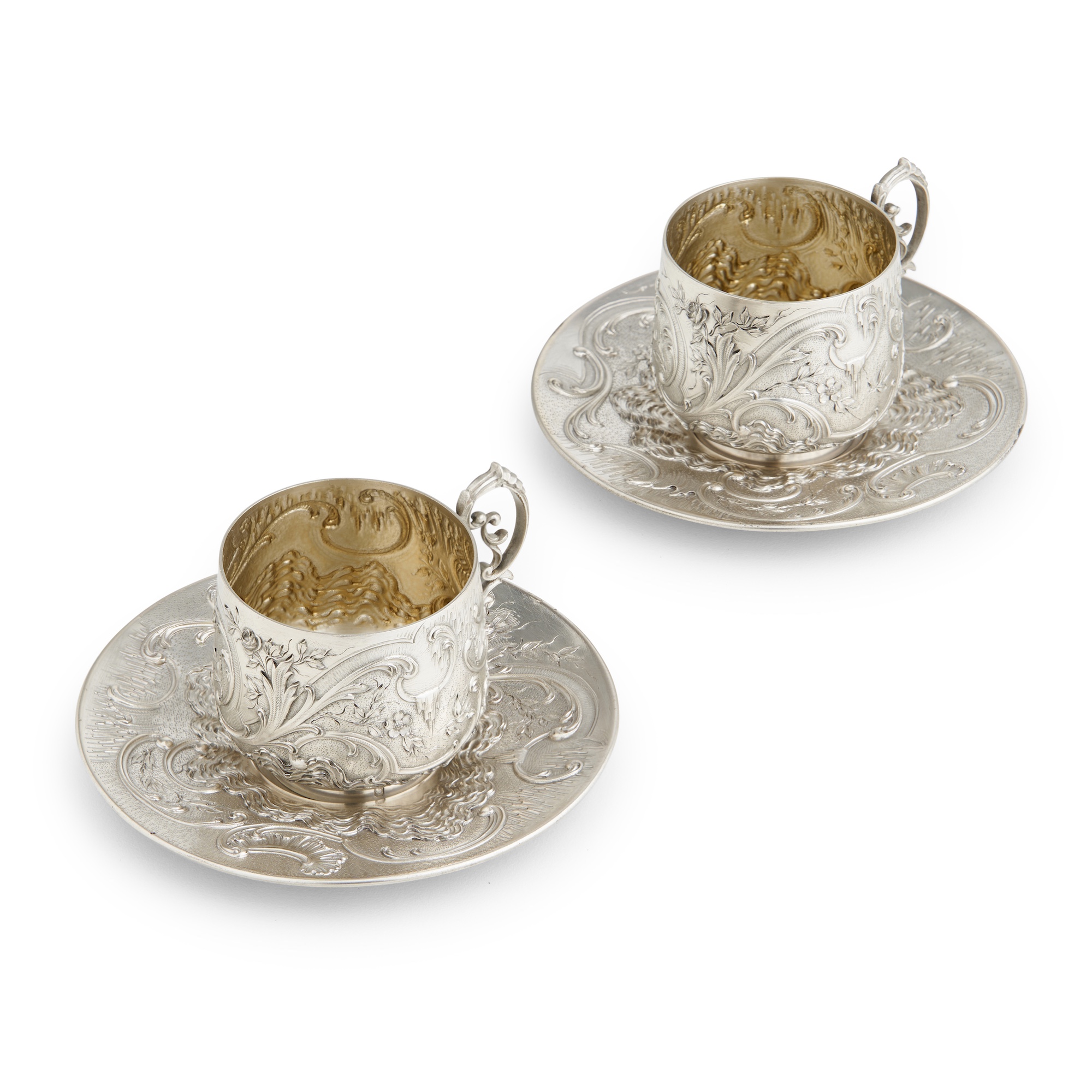A PAIR OF ANTIQUE FRENCH SILVER TEA CUPS AND SAUCERS BY ALBERT BEAUFORT