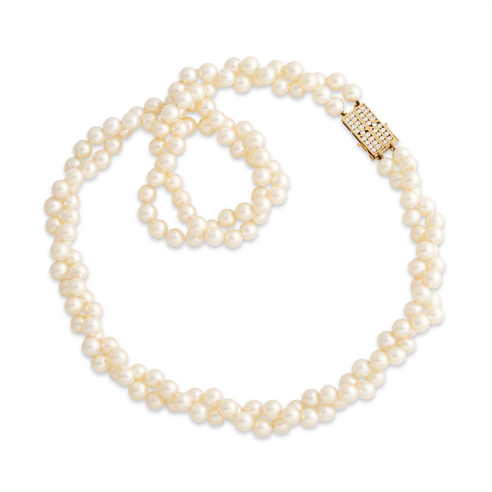 Composed as two individual strands of near round cultured pearls measuring approximately 8.4mm to 8.9mm, completed and connected together by a channel-set brilliant-cut diamond clasp, the diamonds together weighing approximately 1.70 carats, mounted in 18ct gold, inner circumference approximately 765mm and 800mm, gross weight approximately 163.6 grams.