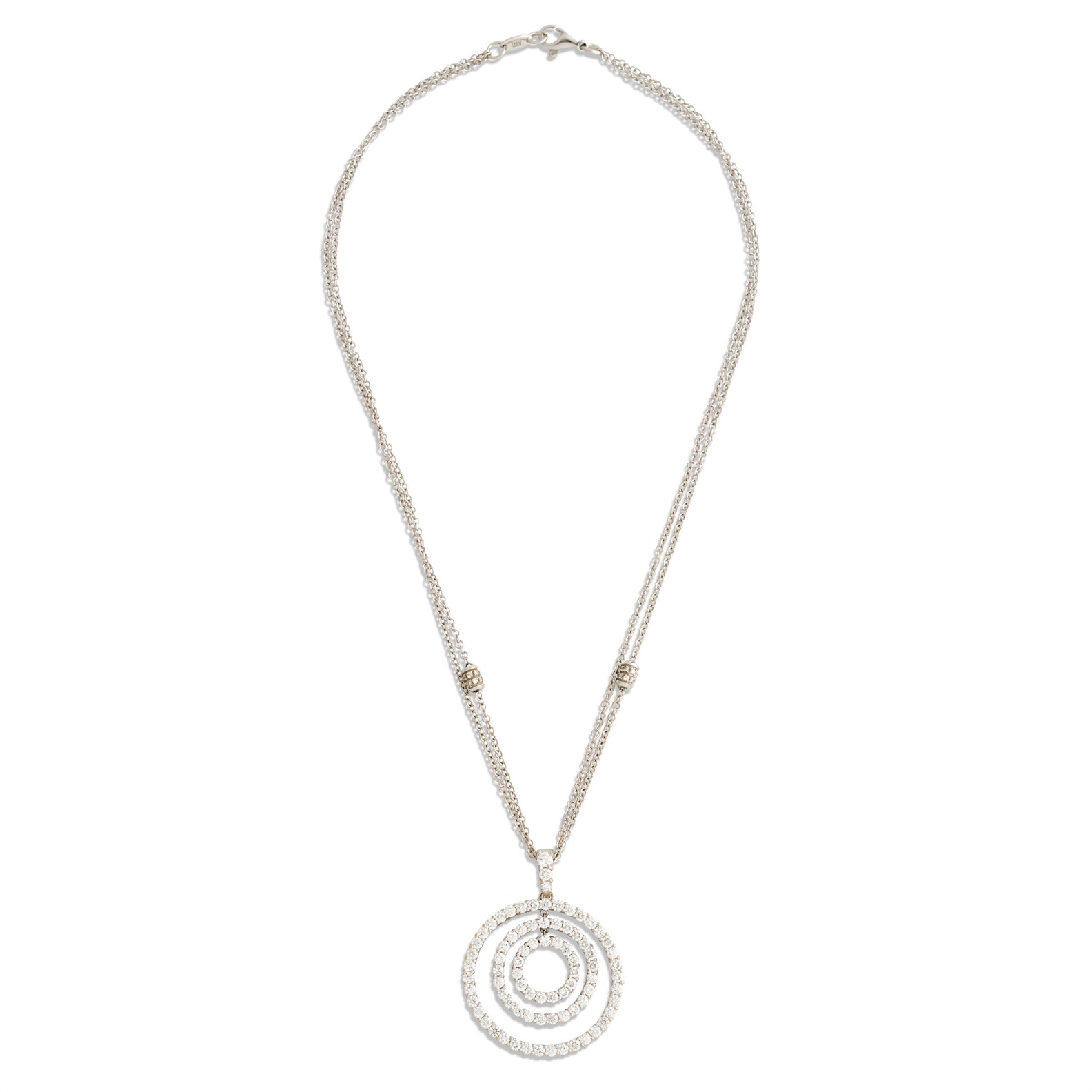 Modelled as 3 open circles of claw-set brilliant-cut diamonds, surmounted by similarly-set bale, supported by a double trace chain interspersed with two pavé-set diamond stations, the diamonds together weighing approximately 3.20 carats, mounted in 18ct gold, inner circumference length 490mm, pendant diameter 35mm, gross weight approximately 17.0 grams, Italian workshop registration marks, signed Leo Pizzo.