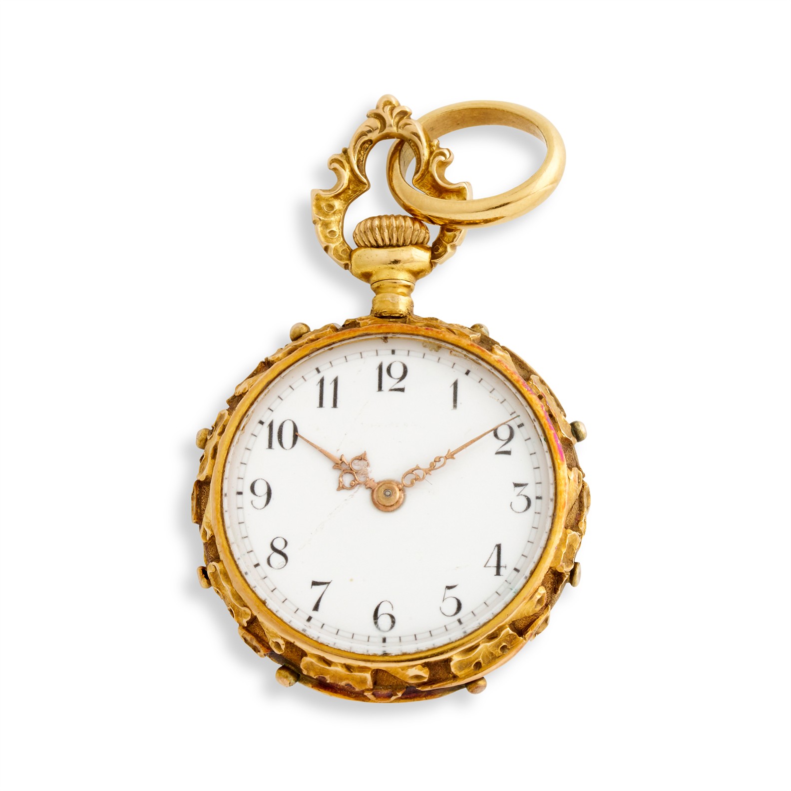 Of antique foliage design, centring a collet-set cabochon emerald, surrounded by collet and claw-set circular-cut diamonds, to the reverse a watch face with a white dial with black Arabic numerals and gold hands, manual wind, length 45mm, width 25mm, gross weight approximately 22.4 grams.