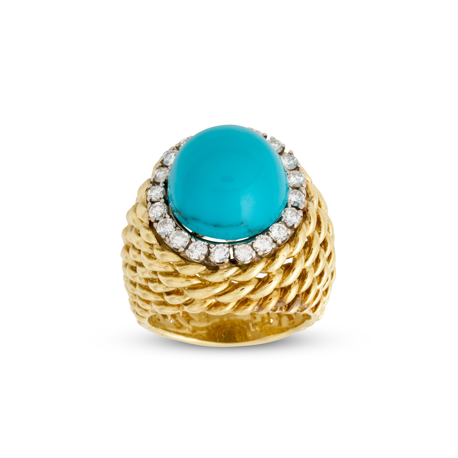 Centring interchangeable turquoise, lapis lazuli and coral cabochons, framed by claw-set brilliant-cut diamonds to a basket weave surround, the diamonds together approximately weighing approximately 0.80 carats, mounted in 18ct gold, size R1/2, gross weight approximately 23.7 grams.