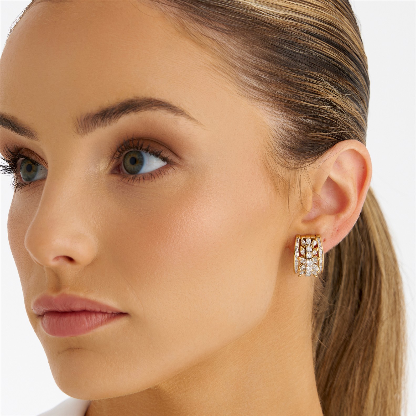 Each half-hoop is of floral design, centring a line of claw-set brilliant-cut diamonds, flanked by similarly set marquise-cut diamonds bordered by channel-set baguettes diamonds, the diamonds together weighing approximately 5.00 carats, mounted in 18ct gold, length 20mm, width 14mm, post and scroll fittings, gross weight approximately 13.3 grams.