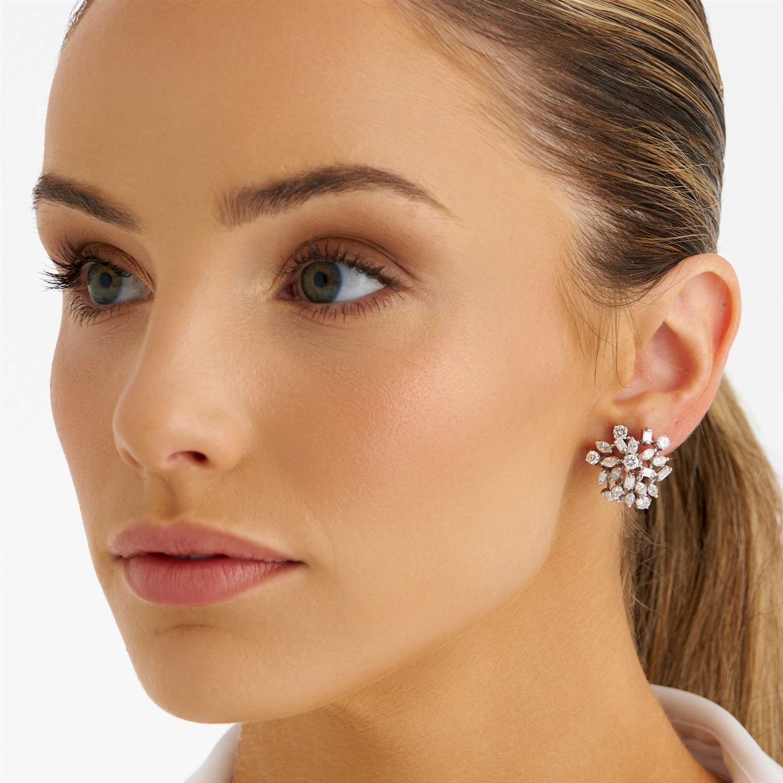 Each of cluster design, claw-set with baguette, marquise, and brilliant-cut diamonds, the diamonds weighing approximately 5.50 carats, mounted in 18ct white gold, length 22mm, post and clip fittings, gross weight approximately 12.0 grams.