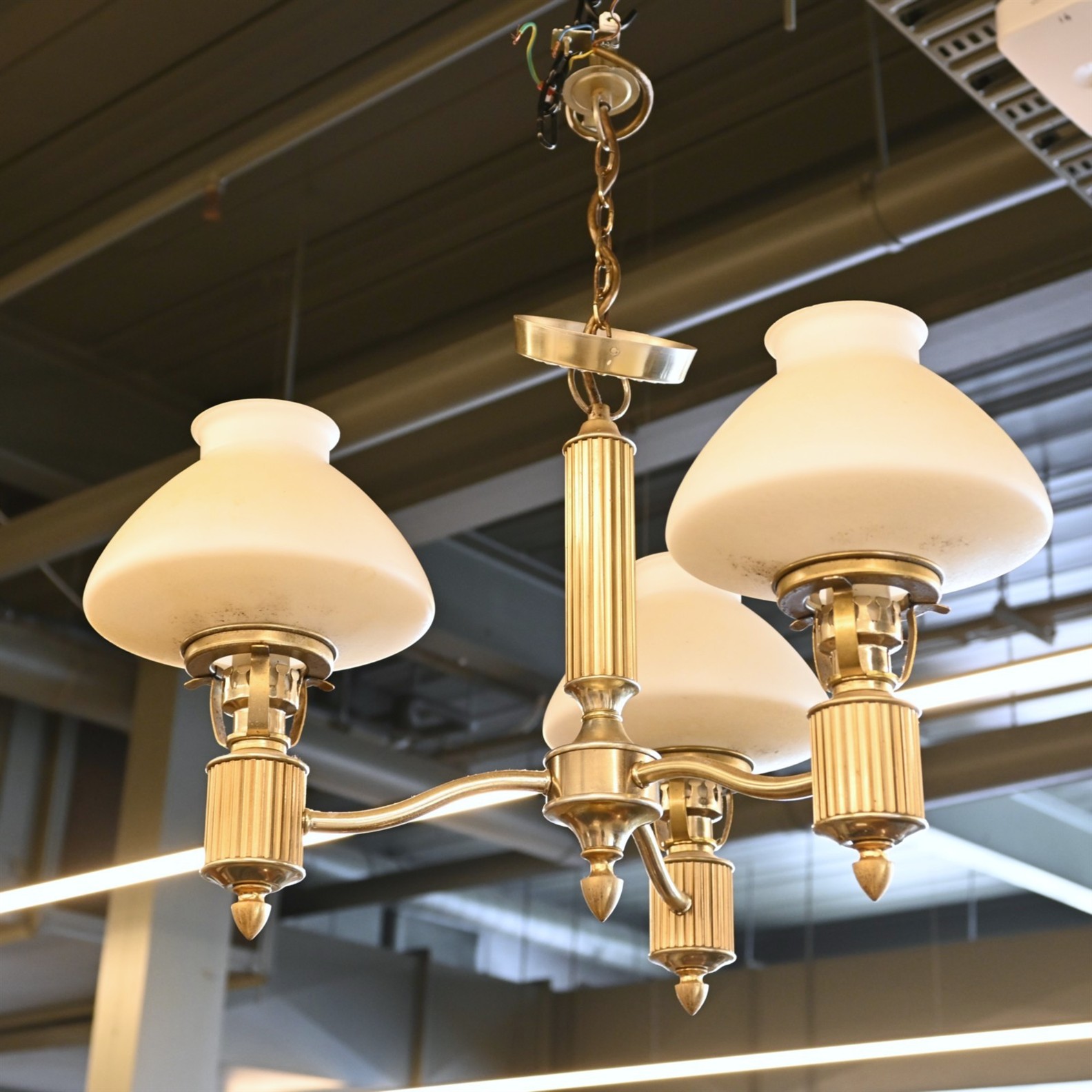 A PAIR OF 1970'S BRASS AND GLASS PENDANT LIGHTS (63CM H X 59CM DIA)