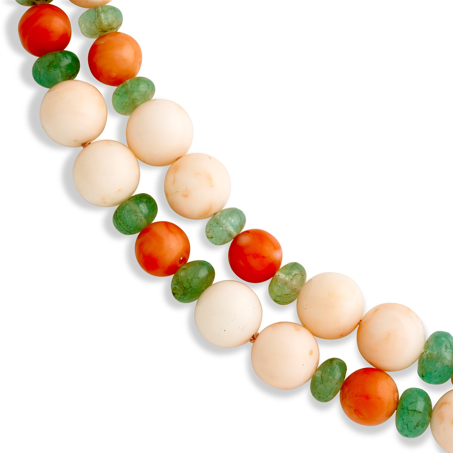 Composed of two rows of angel skin coral beads decorated at intervals with tumbled emeralds and orange coral beads, completed by a 9ct gold bolt ring clasp, inner circumference 490mm, gross weight approximately 110.9 grams.