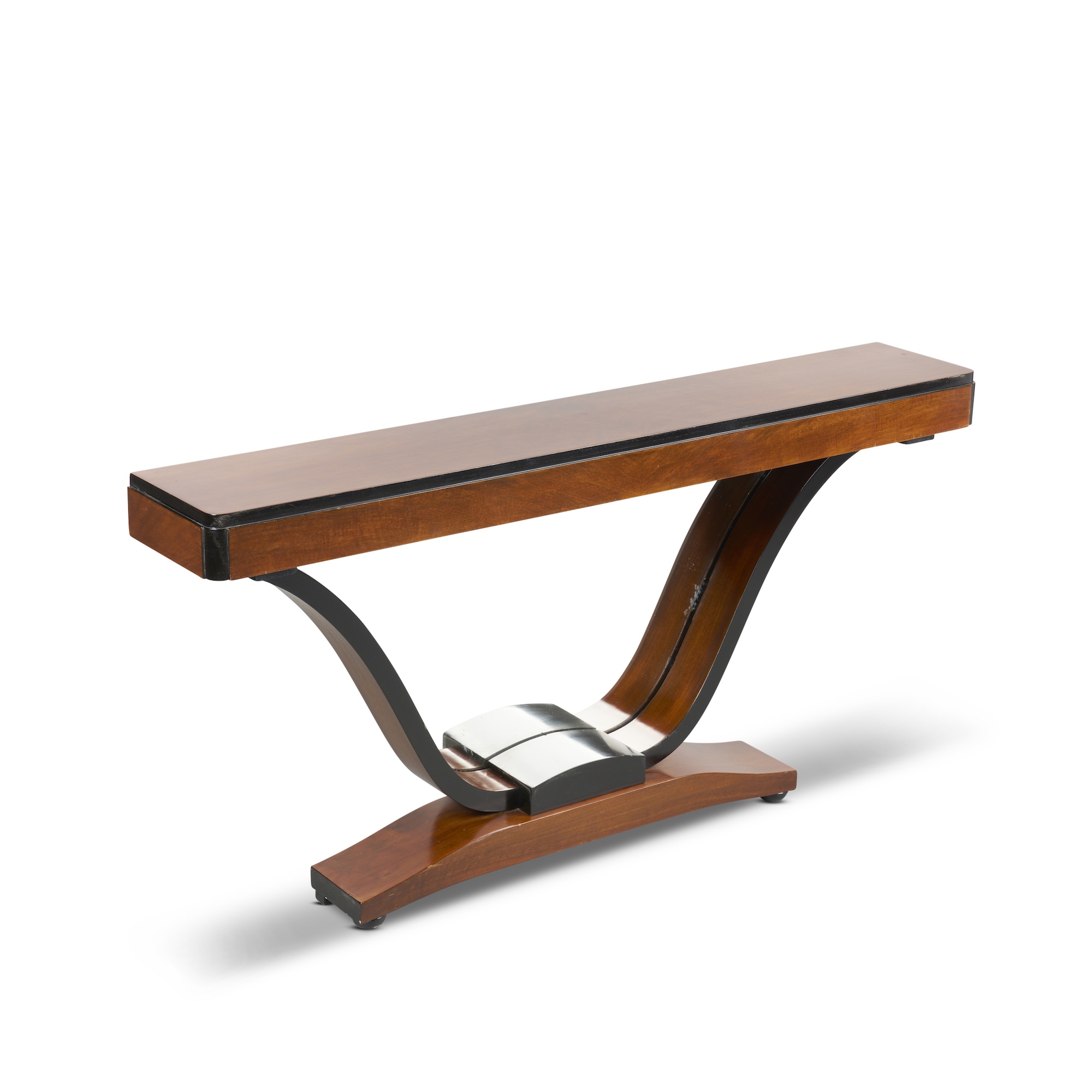 The rectangular top raised on a pair of outswept supports on a platform base, the space between the supports closed with a mirrored back, the recessed edges of the top and parts of the supports and base ebonised