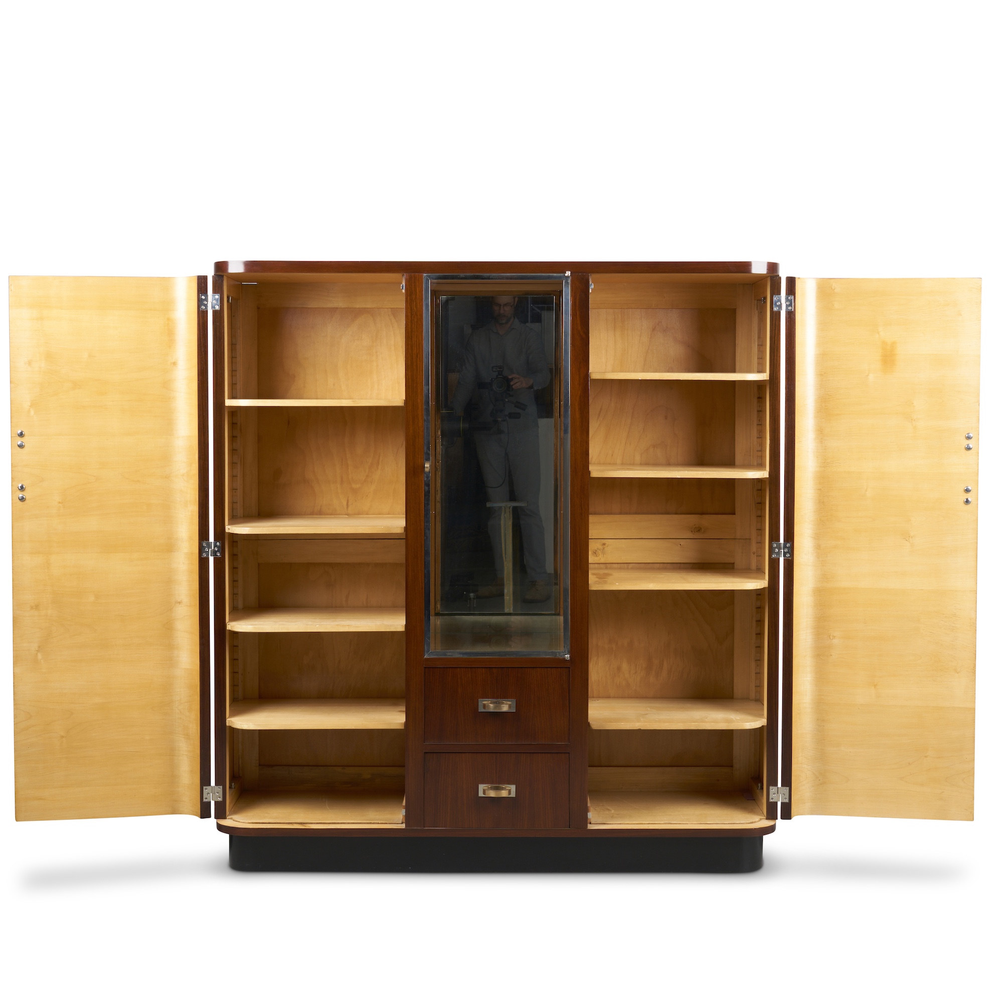 Of rounded rectangular outline, the recessed top above a central chromed metal-framed glazed door enclosing removable glass shelves with two drawers below, the outer doors enclosing adjustable shelves, on a recessed plinth base