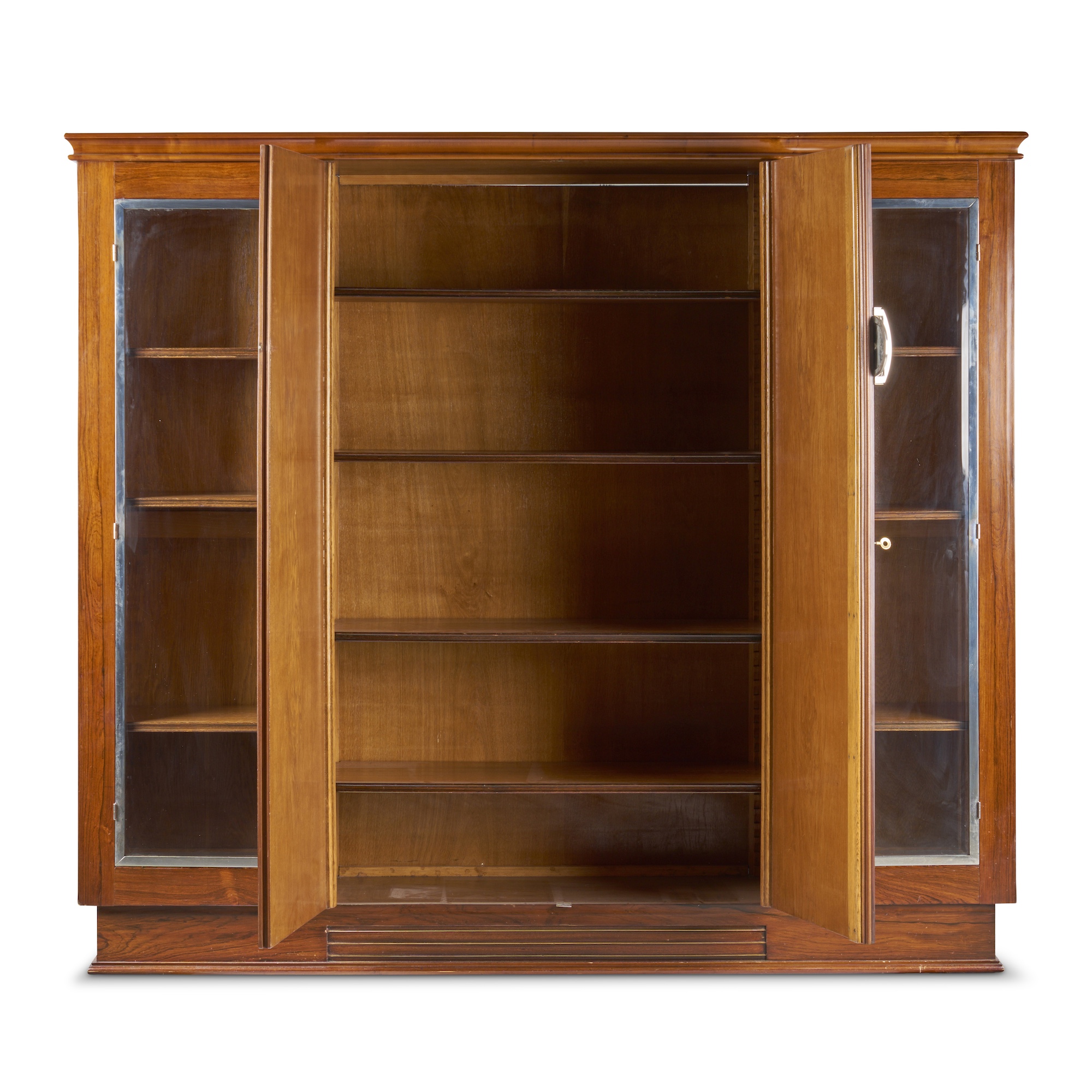 Of rectangular outline, the moulded cornice above a central pair of doors flanked by chromed metal-framed glazed doors, all enclosing adjustable shelves, on a recessed and moulded plinth base
