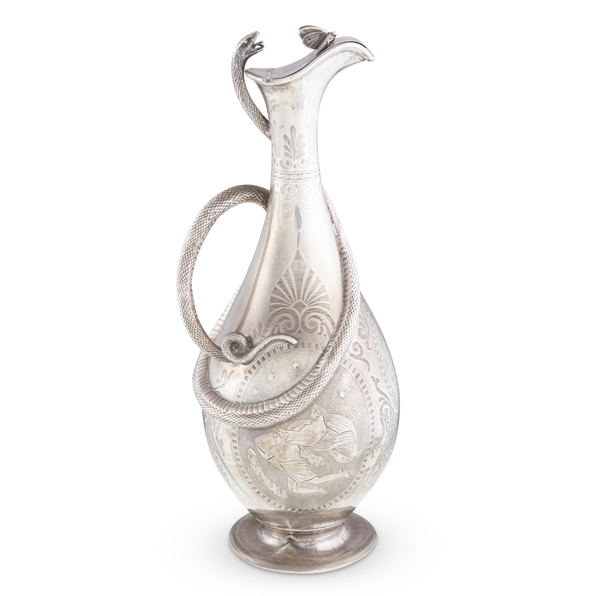 Baluster-shaped on a circular foot, the handle modelled as an encircling serpent, the finial of the cover as a butterfly, the body decorated with engraved palmettes and oval reserves to both sides enclosing Classical Greek figure groups, a reserve below the spout engraved 'Regimental / Hunt Cup / Scots Greys / 1870 / Won by Mr Rowes / "Quicksilver"'