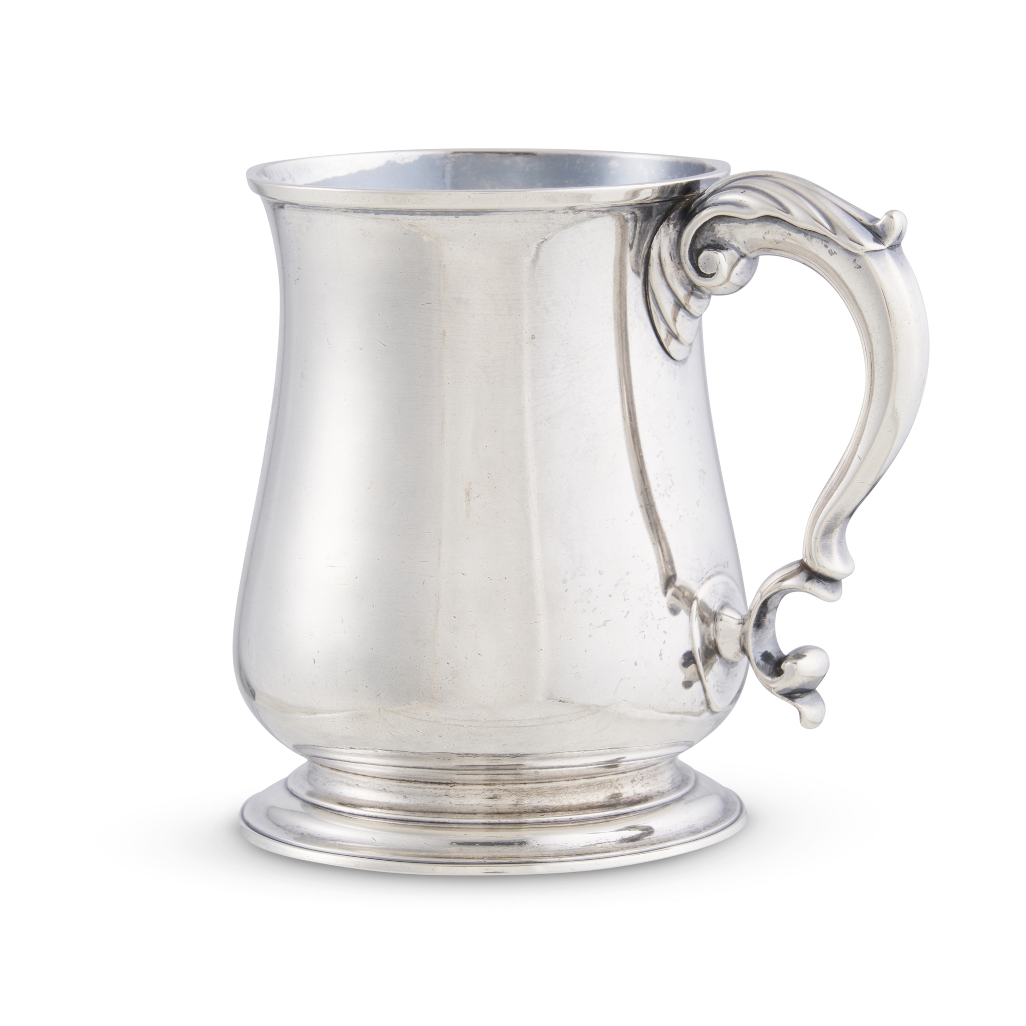 Baluster-shaped with a leaf-capped scrolling handle on a moulded spreading foot, engraved opposite the handle with a crested and mantled coat of arms, the underside engraved 'George Frederick Peel from S.P. 27th Feb. 1921.'
