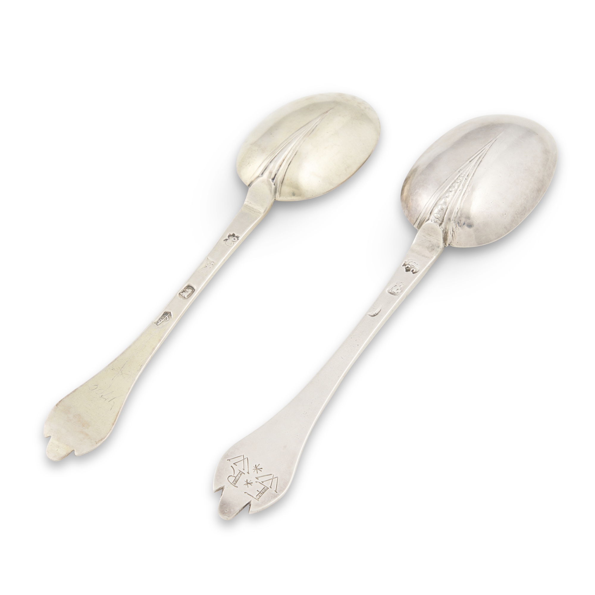 Of typical form, the first spoon with a beaded rat tail, the back of its terminal punched with initials ER and WW, the other silver gilt with a double-struck rat tail