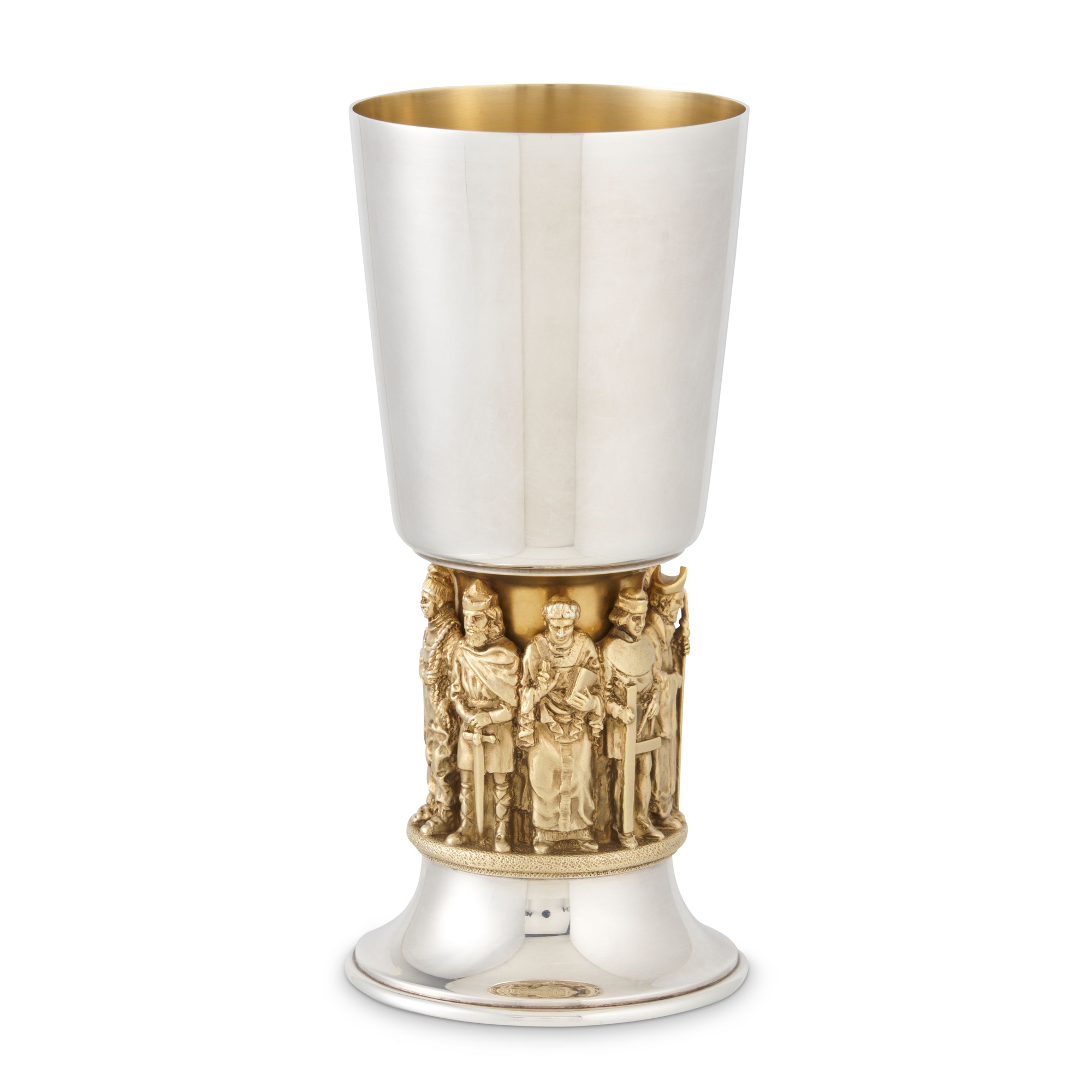 The slightly tapering cylindrical bowl on a gilt stem encircled by figures of Saint Swithun, King Alfred, Bishop Wakelin, William of Wykeham, Prior Kingsmill, Mary Tudor, and others, all on a spreading circular foot, the interior gilt, impressed inscription and number underside, accompanied by Aurum's conformingly numbered booklet on the goblet