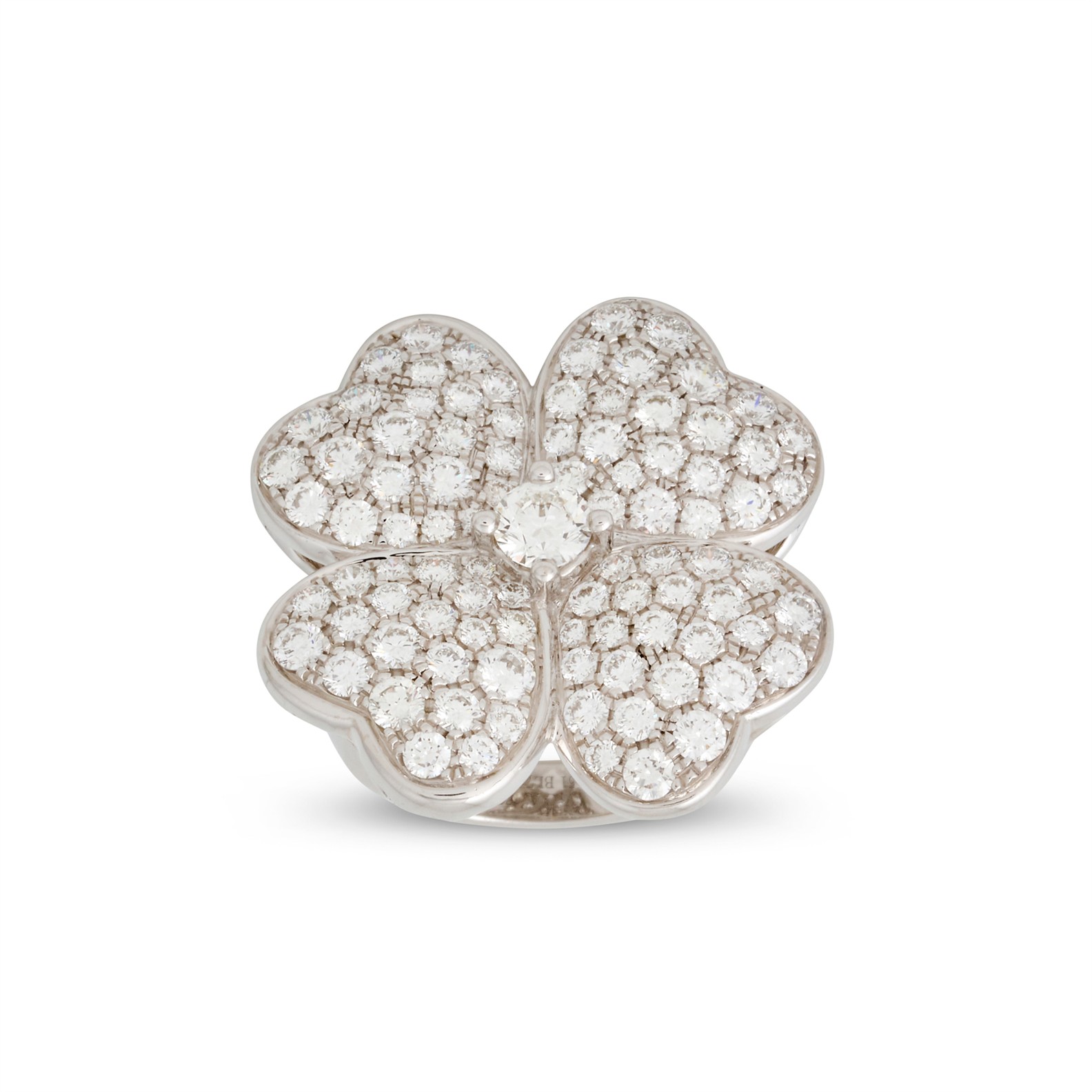 Designed as a clover, the stamen claw-set with a brilliant-cut diamond framed by petals pavé-set with brilliant-cut diamonds, the diamonds together weighing approximately 3.50 to 4.00 carats, mounted in 18ct white gold, size K (51), French assay marks, numbered, signed VCA for Van Cleef and Arpels.