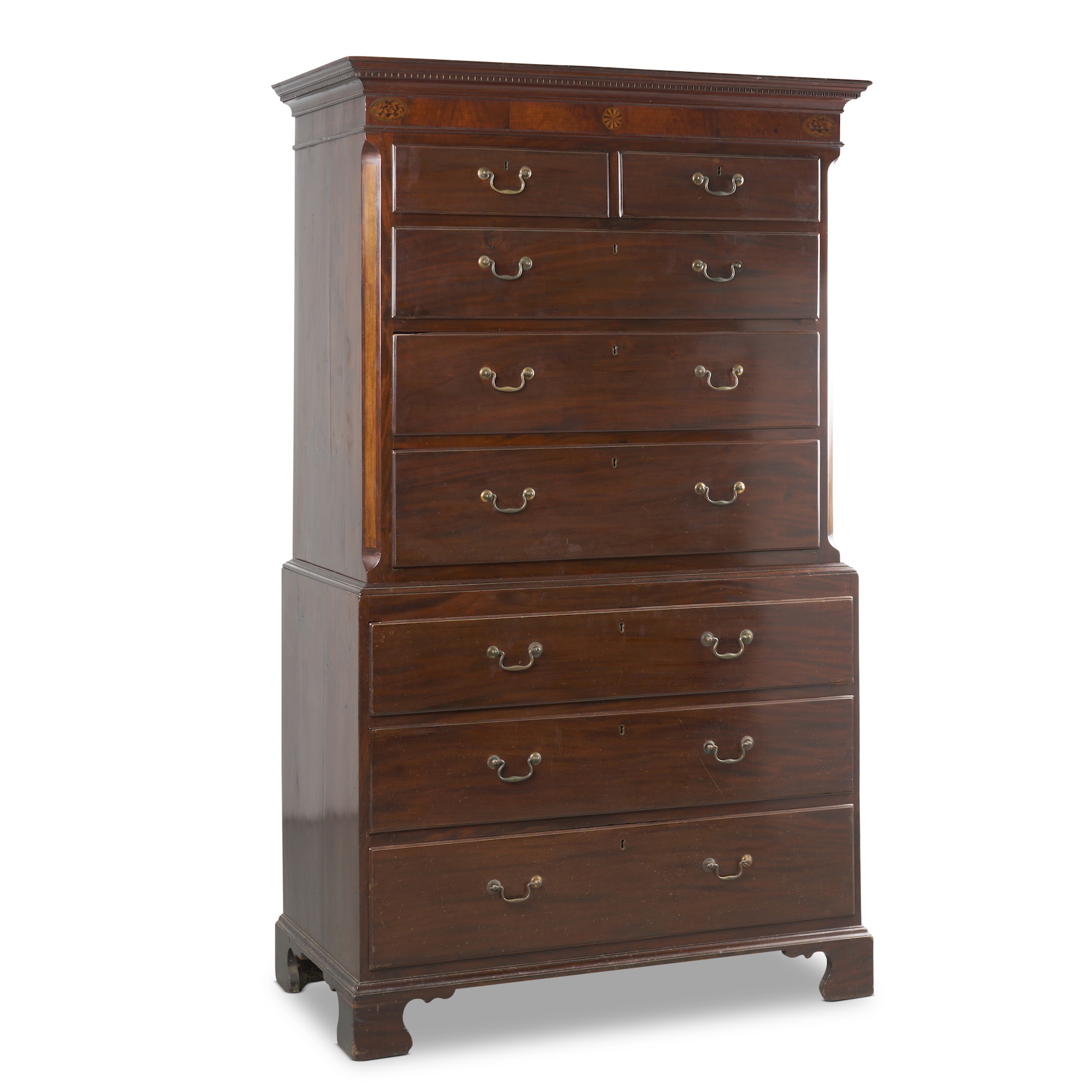 The upper part with a moulded and dentilated cornice and frieze above two short and three long drawers between chamfered front corners, the lower part with three long drawers on shaped bracket feet, the sides in pine in original stain to match the mahogany