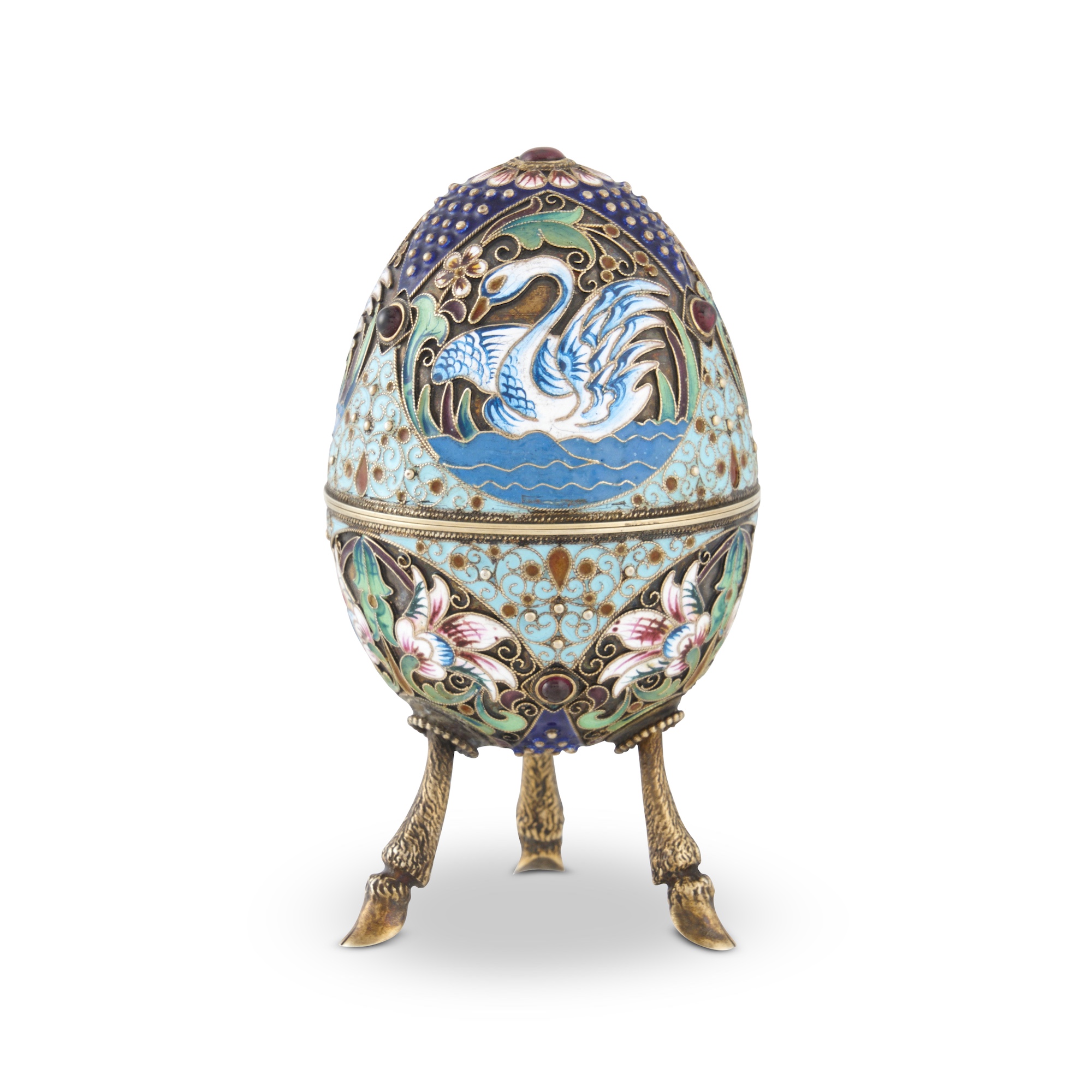 AN ANTIQUE-STYLE RUSSIAN SILVER, CLOISONNÉ, AND JEWELLED EGG-SHAPED BOX ON FEET