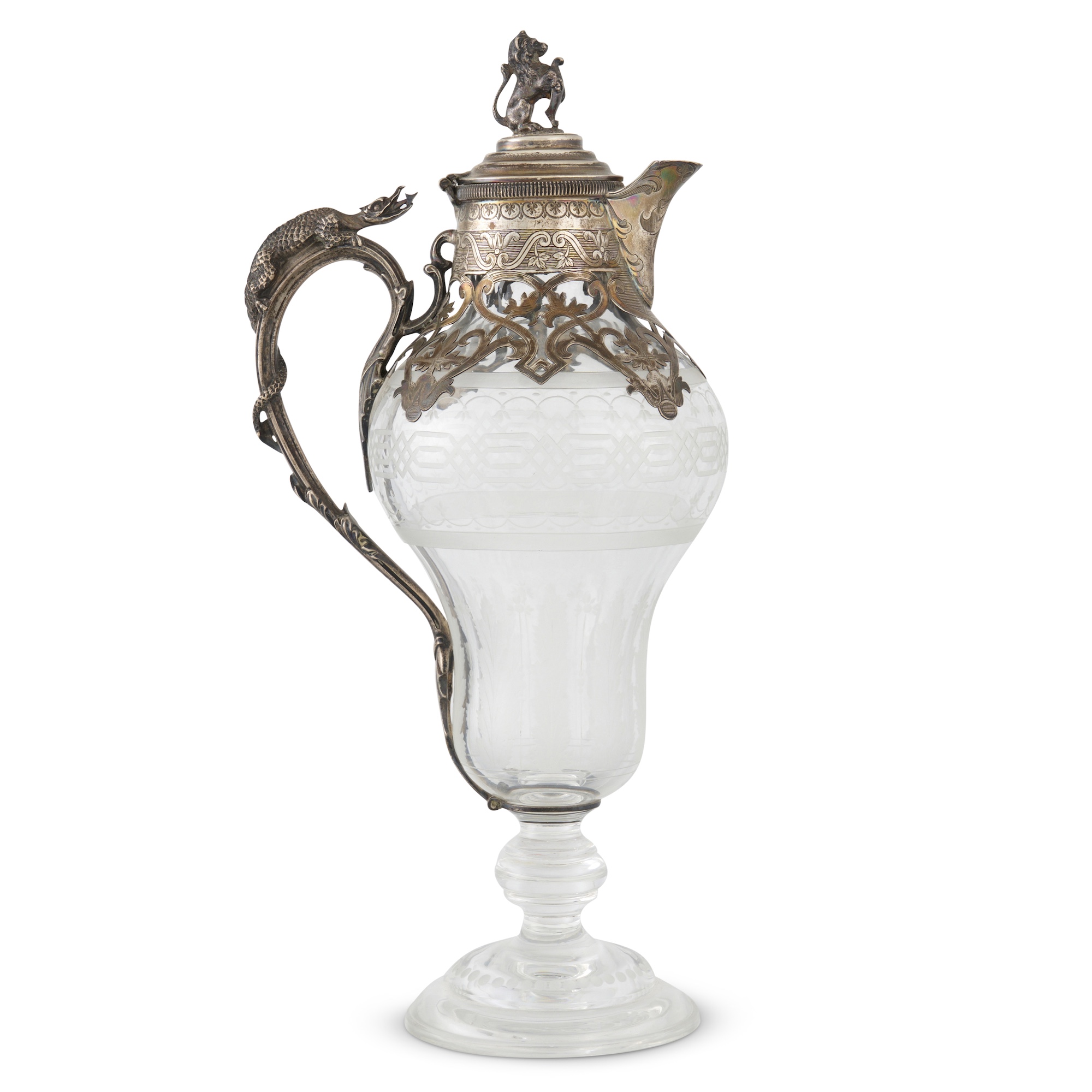 Baluster-shaped on a moulded stem and spreading foot, the glass etched with various geometric and foliate designs, the engraved silver collar and spout descending to foliate open work on the shoulder, the loop handle mounted with a figure of a dragon, the hinged domed cover with a lion rampant finial