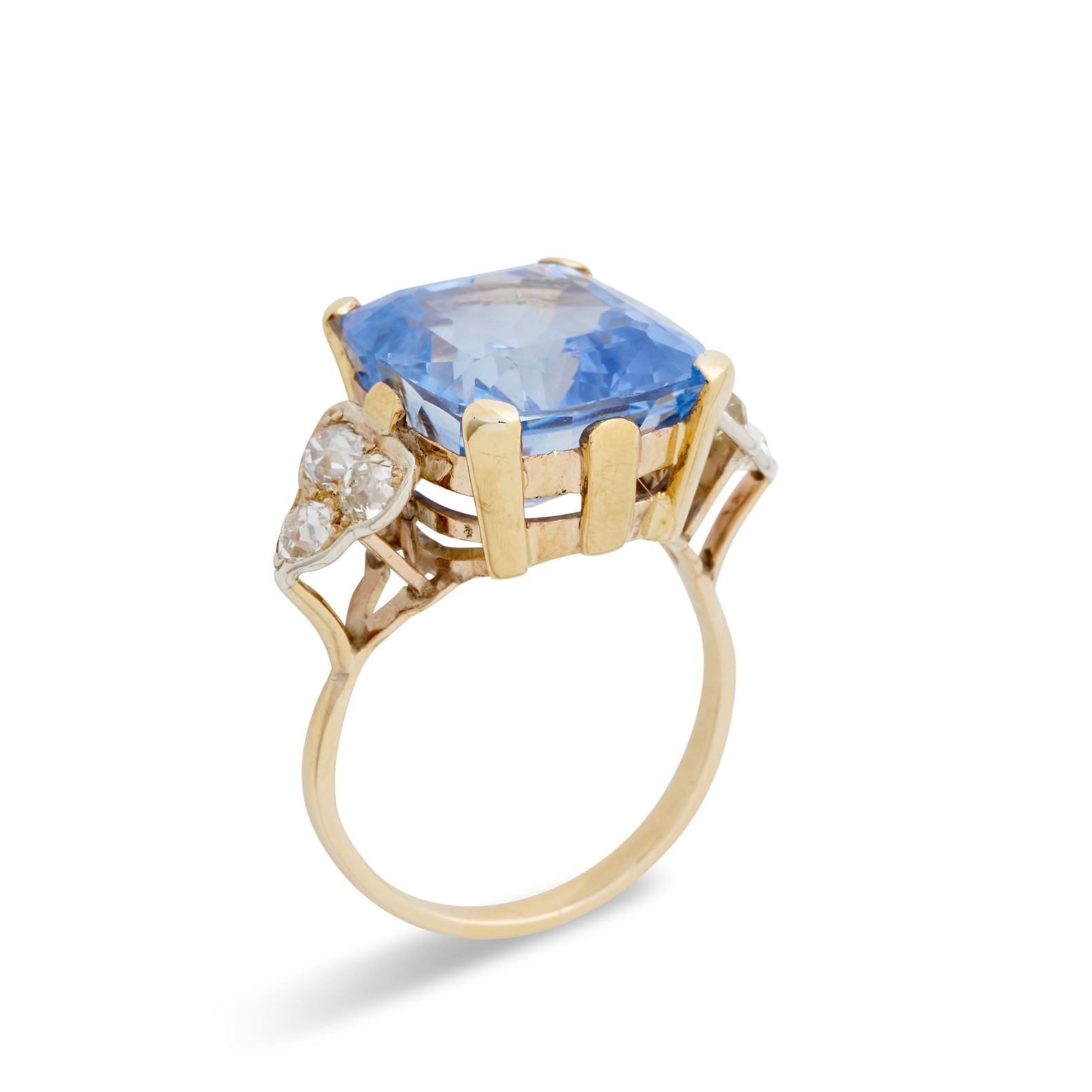Centring a claw-set cushion-shaped sapphire weighing 23.34 carats, to shoulders similarly set with old European-cut diamonds, the diamonds together weighing approximately 0.72 carats, mounted in 14ct gold, size T1/2, gross weight approximately 10.3 grams.