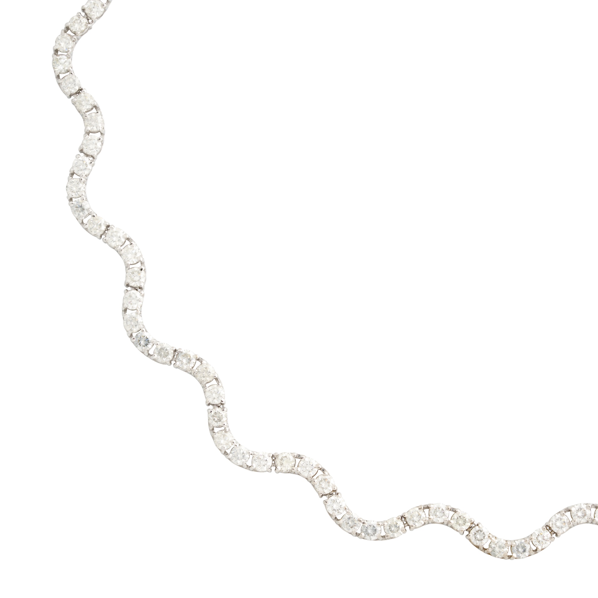 A diamond necklace modelled in curved links featuring one hundred and thirty-four claw-set round brilliant-cut diamonds,to a tongue and groove clasp with safety clip, the diamonds together wweighing approximately 13.55 carats, length approximately 425mm, gross weight approximately 19.7 grams.