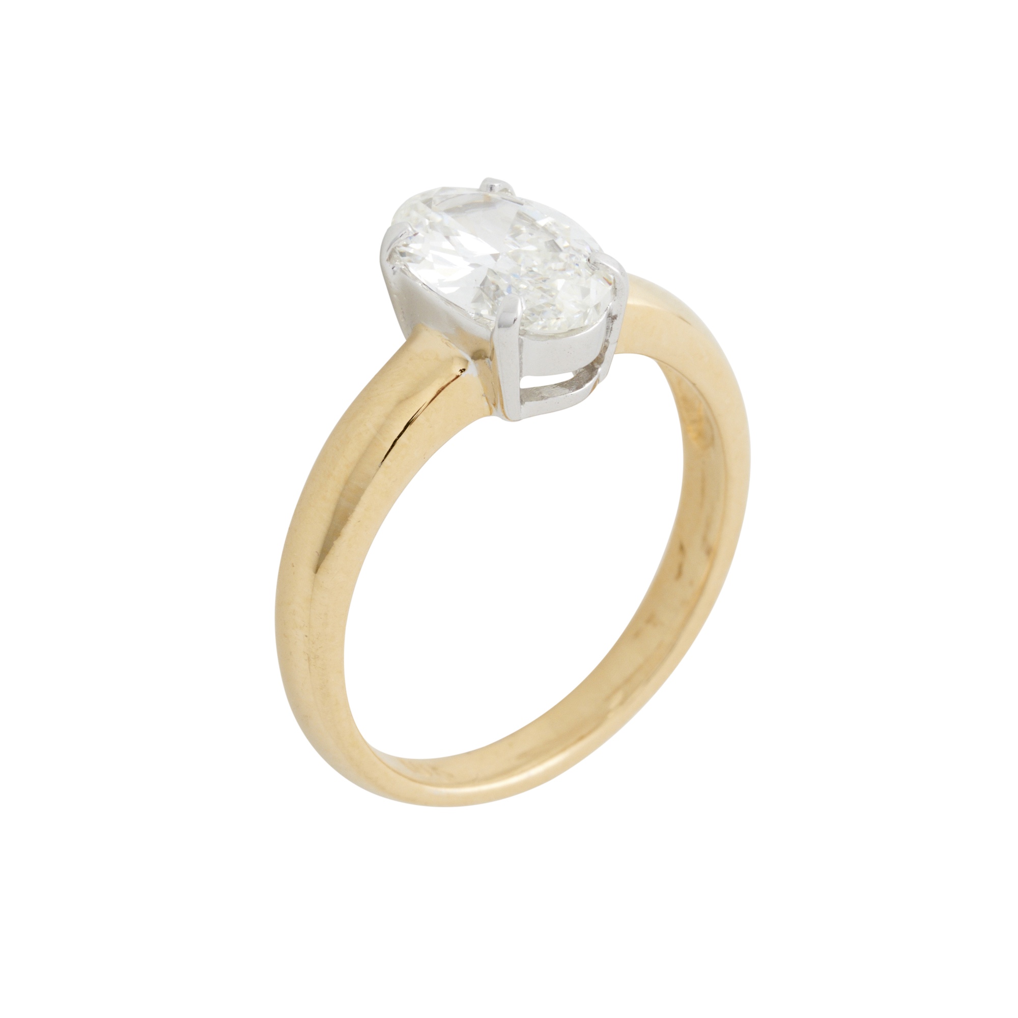 Centring a claw-set oval-cut diamond weighing approximately 1.22 carats, to a low domed, rounded band, size M, gross weight approximately 3.9 grams.