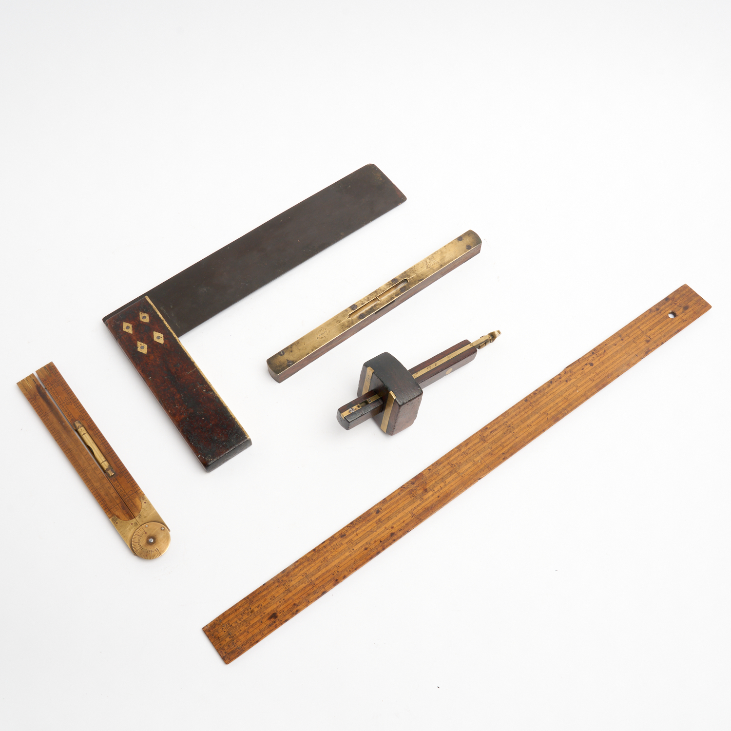 FIVE ANTIQUE TRADEMANS TOOLS, ONE SOLID ROSEWOOD CORNICE MORTICE GAGUE WITH BRASS FITTINGS & STEEL SCREWS L.20.5CM, BOXWOOD SCALE RULER L.60.5CM, RABONES BOXWOOD ANGLE FOLDING RULER WITH SPIRIT LEVEL & DOUBLE HINGE TO FORFOLD (EXTENDED 24.5CM), ROSEWOOD AND BRASS RIGHT ANGLED SQUARE L.36CM, ROSEWOOD & BRASS SPIRIT LEVEL BY J BUST OF EDINBURGH L.27CM